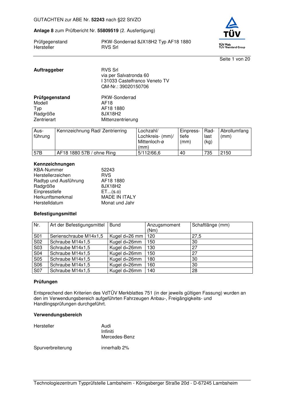 Dieses Gutachten (abe) bezieht sich auf die Alufelge RVS Srl AF18 1880 in der Ausführung ET 0, Mittenloch 0 mm (KBA 52243). Im PDF findest du typischerweise zulässige Reifengrößen, Auflagen/Anbauhinweise und – je nach Dokument – Hinweise zur Eintragung.