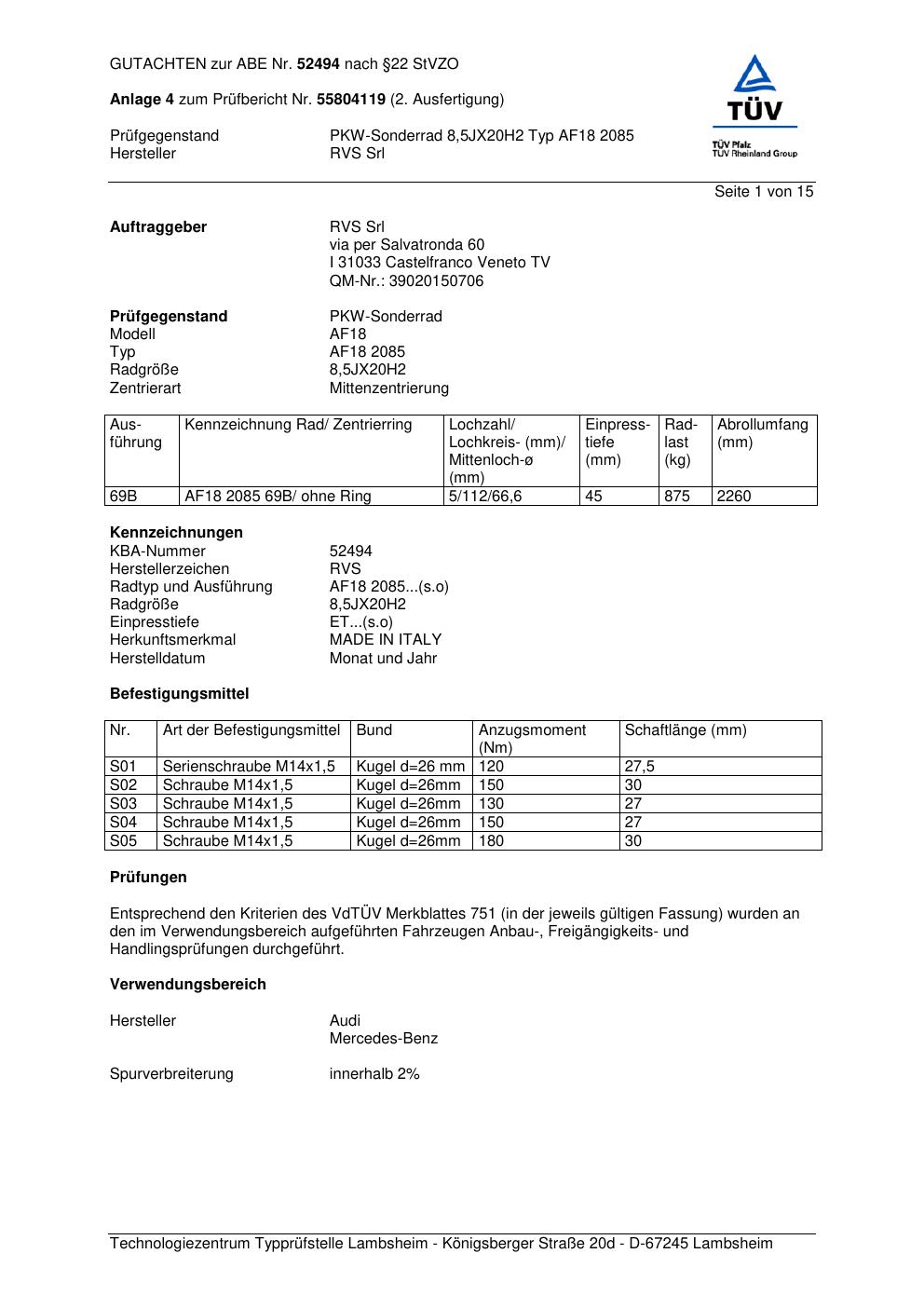 Dieses Gutachten (abe) bezieht sich auf die Alufelge RVS Srl AF18 208 5 in der Ausführung ET 0, Mittenloch 0 mm (KBA 52494). Im PDF findest du typischerweise zulässige Reifengrößen, Auflagen/Anbauhinweise und – je nach Dokument – Hinweise zur Eintragung.