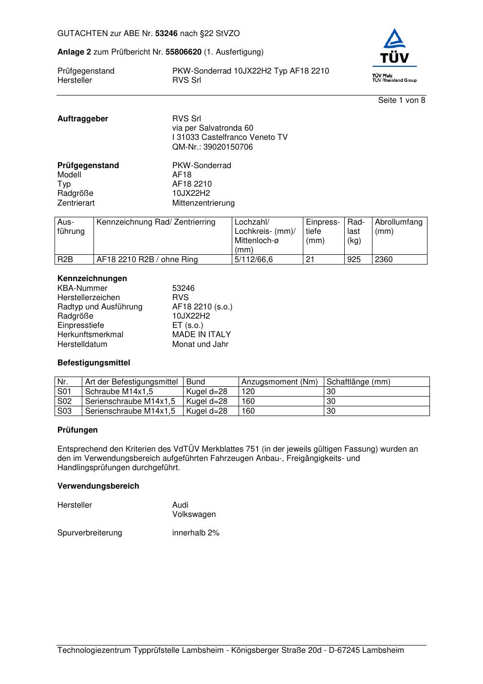 Dieses Gutachten (abe) bezieht sich auf die Alufelge RVS Srl AF18 2210 in der Ausführung ET 0, Mittenloch 0 mm (KBA 53246). Im PDF findest du typischerweise zulässige Reifengrößen, Auflagen/Anbauhinweise und – je nach Dokument – Hinweise zur Eintragung.