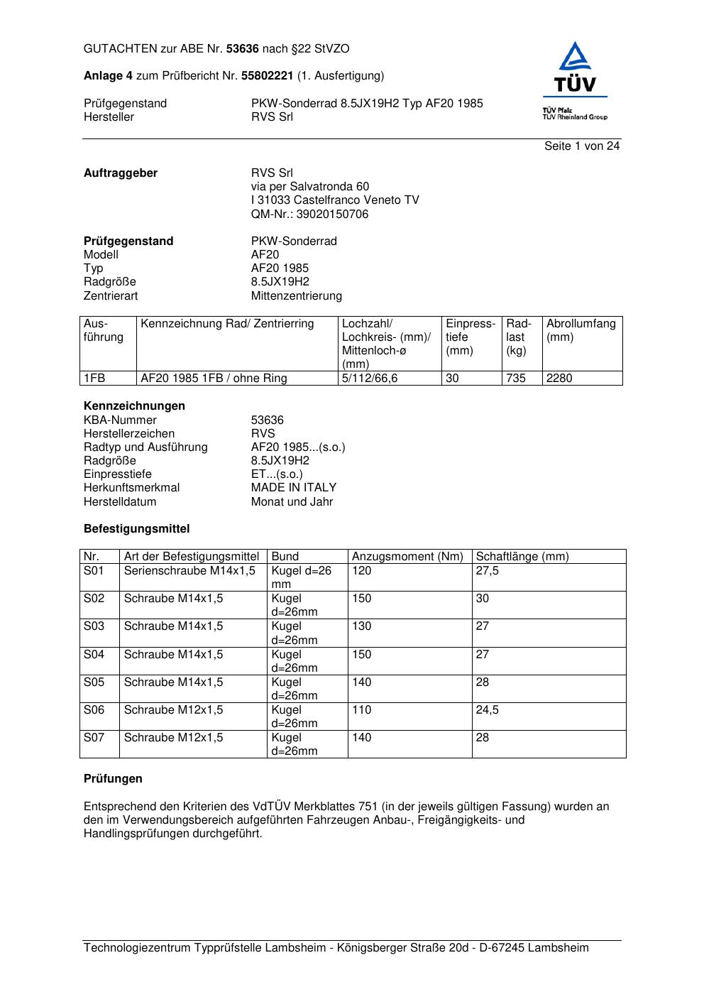 Dieses Gutachten (abe) bezieht sich auf die Alufelge RVS Srl AF20 198 5 in der Ausführung ET 0, Mittenloch 0 mm (KBA 53636). Im PDF findest du typischerweise zulässige Reifengrößen, Auflagen/Anbauhinweise und – je nach Dokument – Hinweise zur Eintragung.