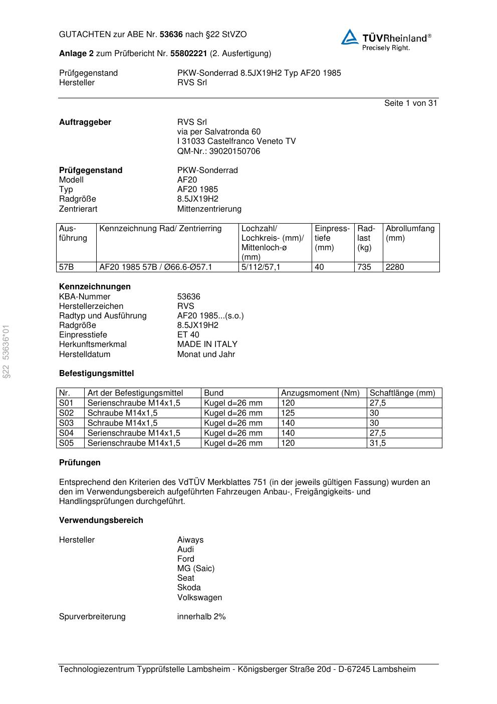 Dieses Gutachten (abe) bezieht sich auf die Alufelge RVS Srl AF20 198 5 in der Ausführung ET 0, Mittenloch 0 mm (KBA 53636). Im PDF findest du typischerweise zulässige Reifengrößen, Auflagen/Anbauhinweise und – je nach Dokument – Hinweise zur Eintragung.