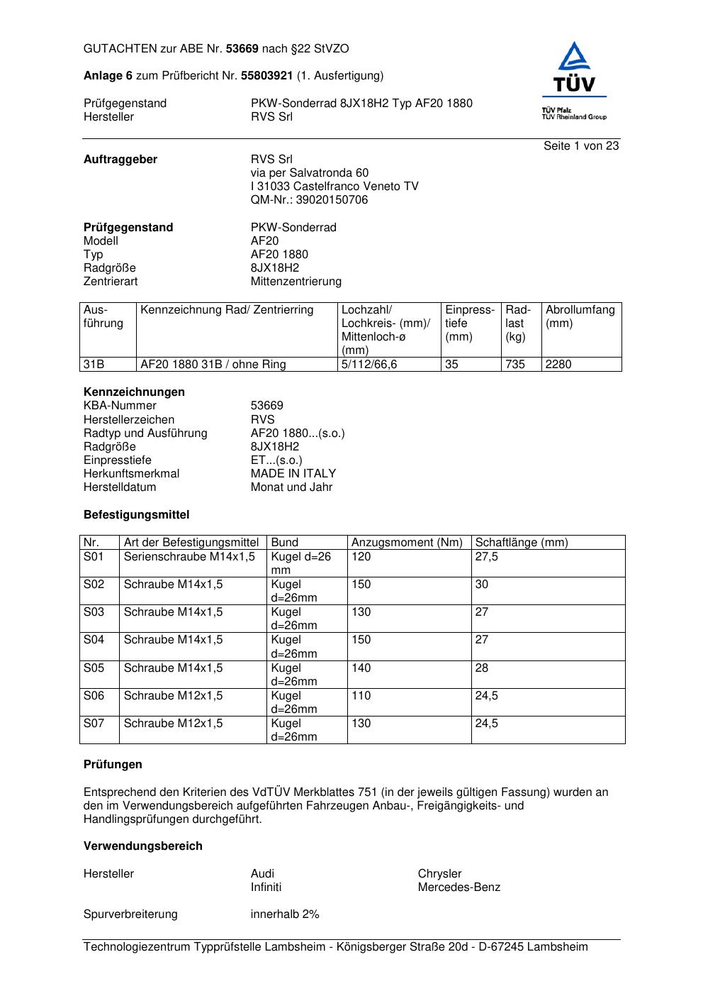 Dieses Gutachten (abe) bezieht sich auf die Alufelge RVS Srl AF20 1880 in der Ausführung ET 0, Mittenloch 0 mm (KBA 53669). Im PDF findest du typischerweise zulässige Reifengrößen, Auflagen/Anbauhinweise und – je nach Dokument – Hinweise zur Eintragung.
