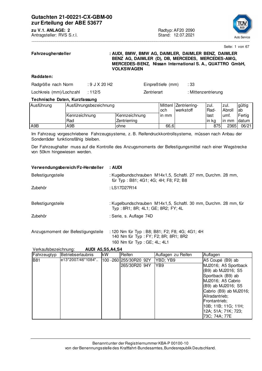Dieses Gutachten (abe) bezieht sich auf die Alufelge RVS S.r.l. AF20 2090 in der Ausführung ET 0, Mittenloch 0 mm (KBA 53677). Im PDF findest du typischerweise zulässige Reifengrößen, Auflagen/Anbauhinweise und – je nach Dokument – Hinweise zur Eintragung.