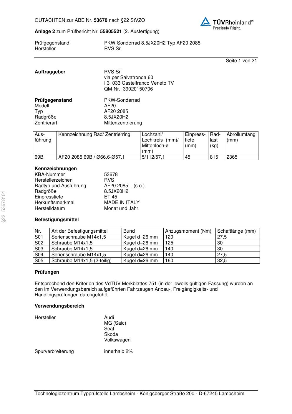 Dieses Gutachten (abe) bezieht sich auf die Alufelge RVS Srl AF20 2085 in der Ausführung ET 0, Mittenloch 0 mm (KBA 53678). Im PDF findest du typischerweise zulässige Reifengrößen, Auflagen/Anbauhinweise und – je nach Dokument – Hinweise zur Eintragung.