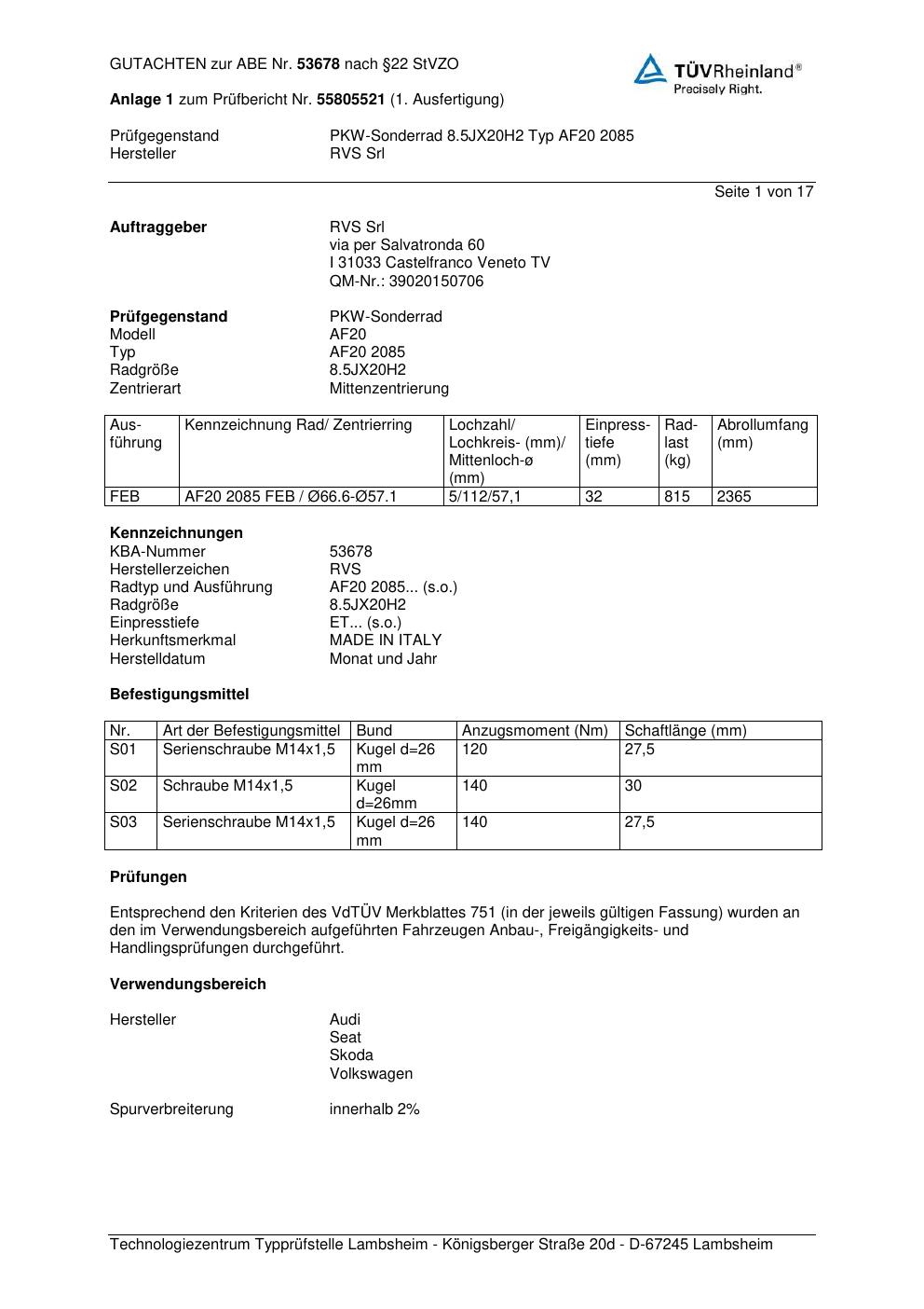 Dieses Gutachten (abe) bezieht sich auf die Alufelge RVS Srl AF20 208 5 in der Ausführung ET 0, Mittenloch 0 mm (KBA 53678). Im PDF findest du typischerweise zulässige Reifengrößen, Auflagen/Anbauhinweise und – je nach Dokument – Hinweise zur Eintragung.