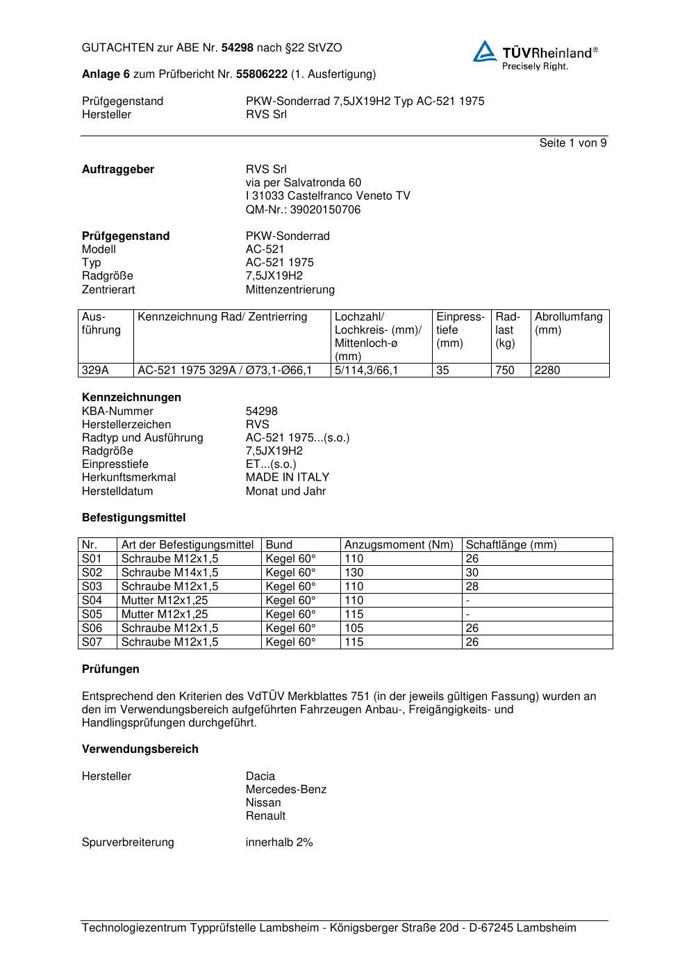 Dieses Gutachten (abe) bezieht sich auf die Alufelge RVS AC-521 1975 in der Ausführung ET 0, Mittenloch 0 mm (KBA 54298). Im PDF findest du typischerweise zulässige Reifengrößen, Auflagen/Anbauhinweise und – je nach Dokument – Hinweise zur Eintragung.