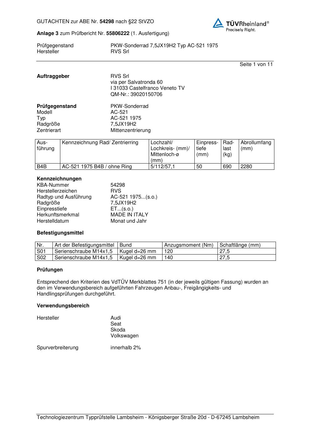 Felgengutachten / abe für Alufelgen RVS AC-521 1975 (ET 0, Mittenloch 0 mm) mit KBA 54298 (Zertifikatsnummer 54298). Hier kostenlos als PDF herunterladen. Der Download-Link ist 24 Stunden gültig und kann bis zu zwei Mal verwendet werden.