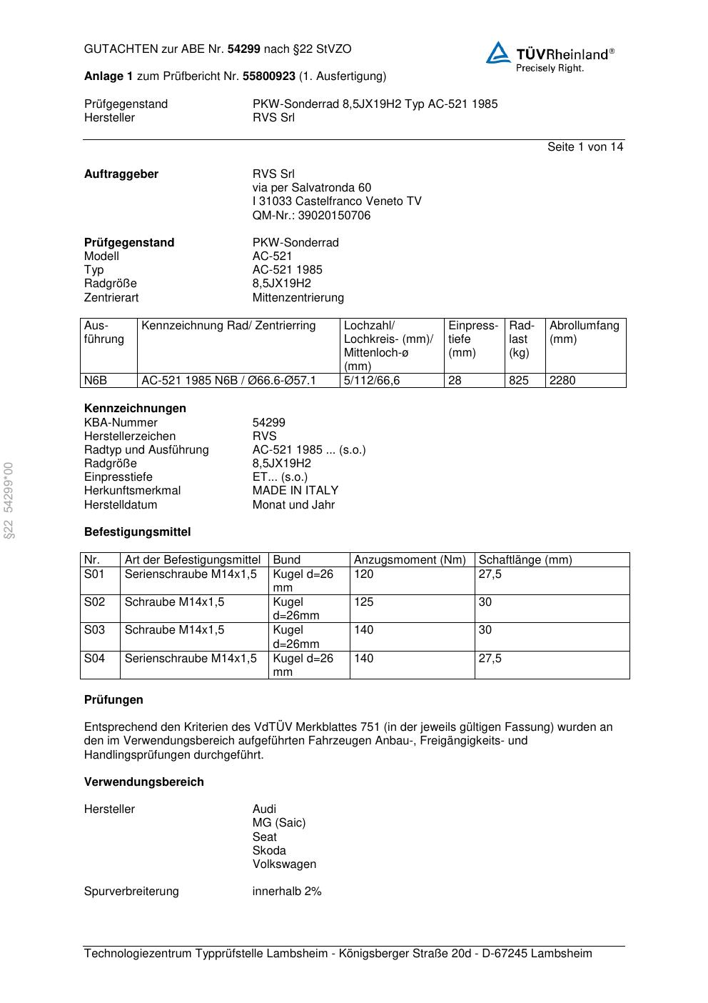 Dieses Gutachten (abe) bezieht sich auf die Alufelge RVS Srl AC-521 1 985 in der Ausführung ET 0, Mittenloch 0 mm (KBA 54299). Im PDF findest du typischerweise zulässige Reifengrößen, Auflagen/Anbauhinweise und – je nach Dokument – Hinweise zur Eintragung.