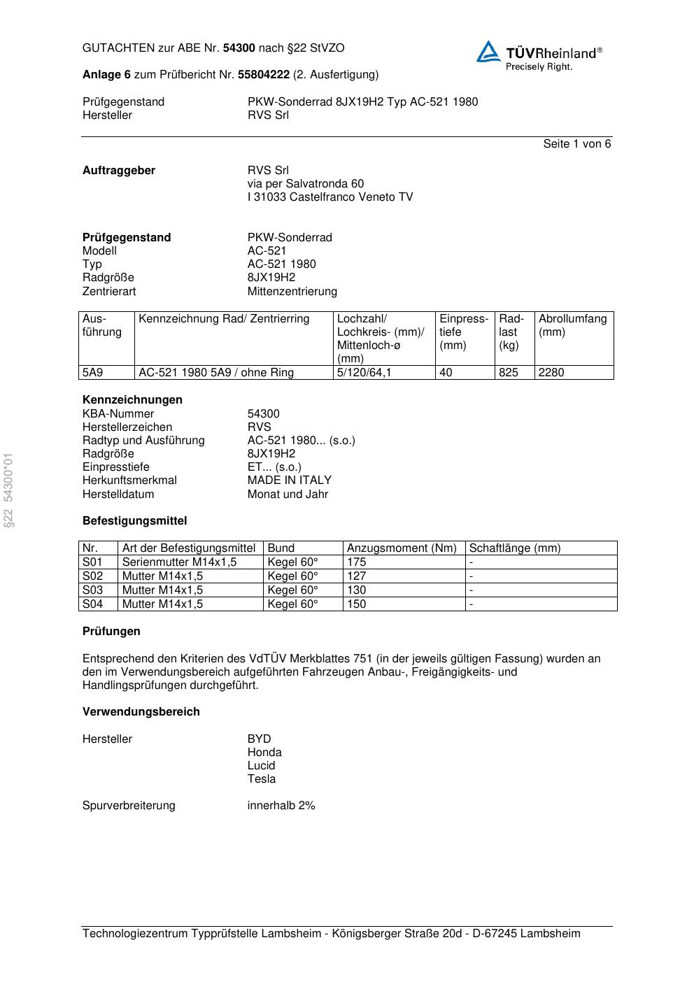 Dieses Gutachten (abe) bezieht sich auf die Alufelge RVS AC-521 198 0 in der Ausführung ET 0, Mittenloch 0 mm (KBA 54300). Im PDF findest du typischerweise zulässige Reifengrößen, Auflagen/Anbauhinweise und – je nach Dokument – Hinweise zur Eintragung.