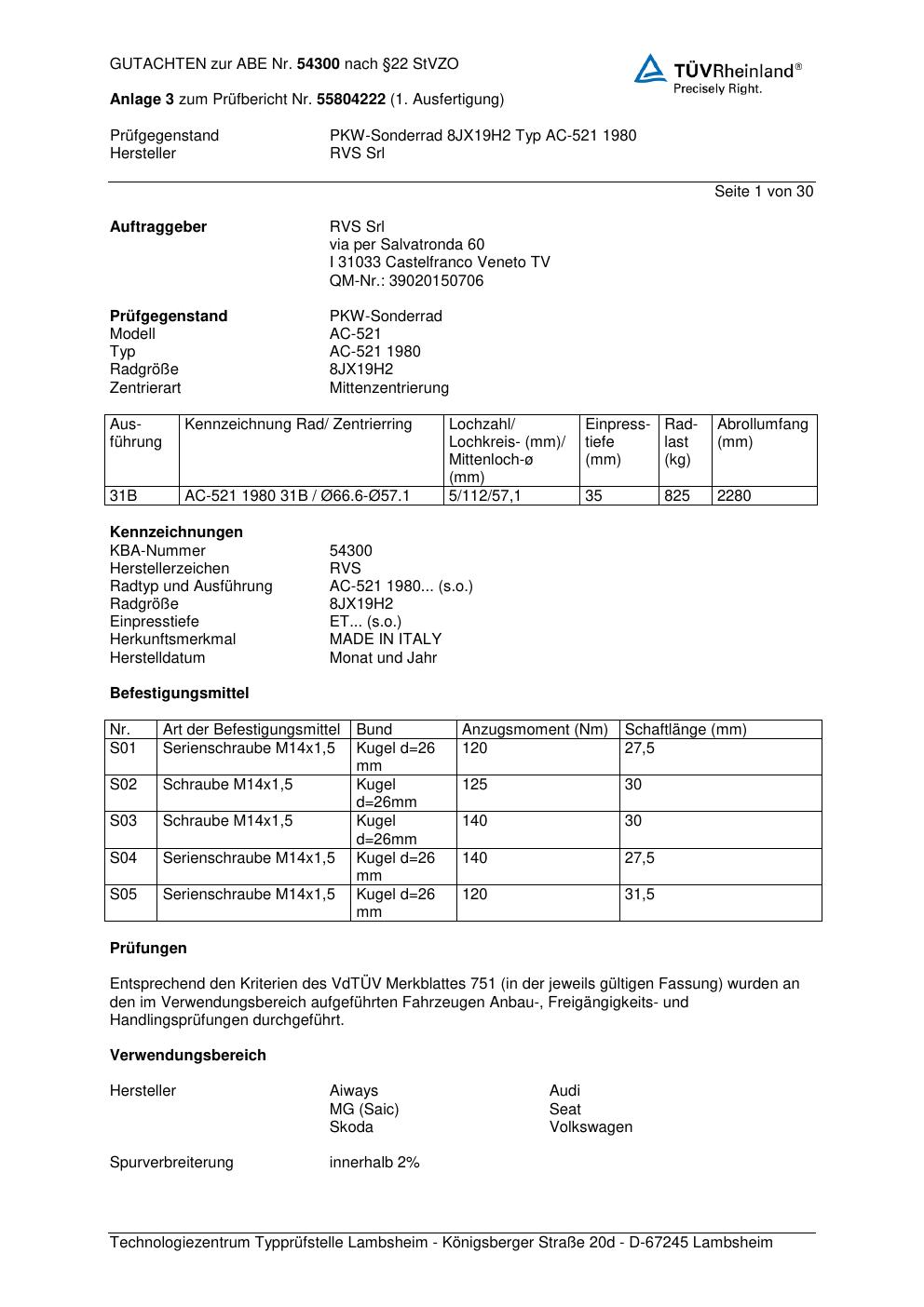 Dieses Gutachten (abe) bezieht sich auf die Alufelge RVS AC-521 198 0 in der Ausführung ET 0, Mittenloch 0 mm (KBA 54300). Im PDF findest du typischerweise zulässige Reifengrößen, Auflagen/Anbauhinweise und – je nach Dokument – Hinweise zur Eintragung.