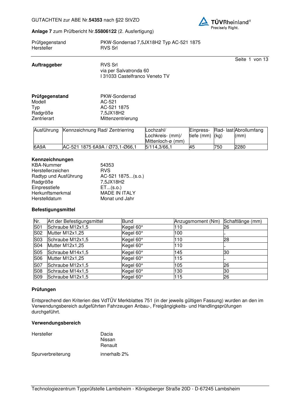 Dieses Gutachten (abe) bezieht sich auf die Alufelge RVS AC-521 1875 in der Ausführung ET 0, Mittenloch 0 mm (KBA 54353). Im PDF findest du typischerweise zulässige Reifengrößen, Auflagen/Anbauhinweise und – je nach Dokument – Hinweise zur Eintragung.