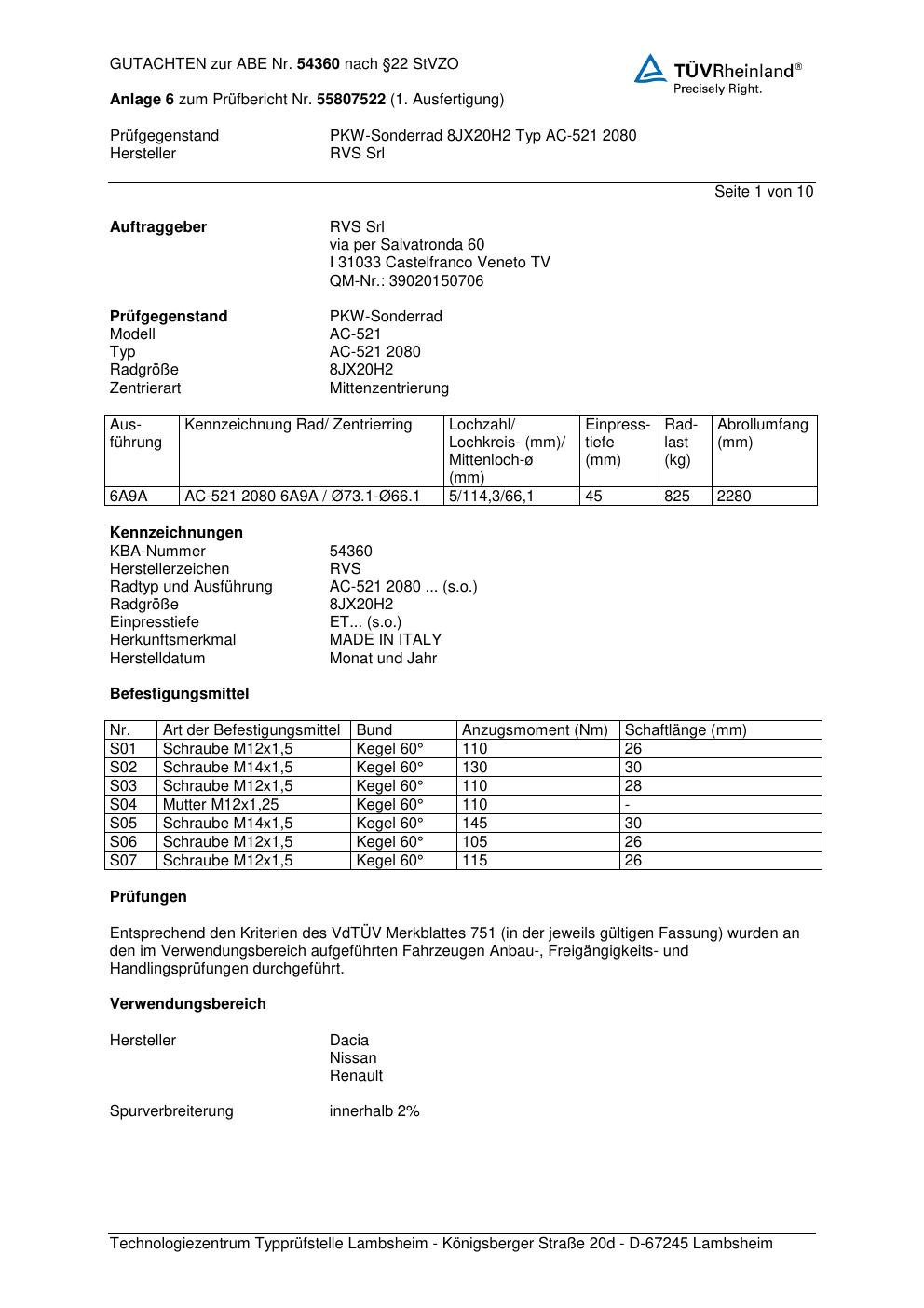 Dieses Gutachten (abe) bezieht sich auf die Alufelge RVS Srl AC-521 2080 in der Ausführung ET 0, Mittenloch 0 mm (KBA 54360). Im PDF findest du typischerweise zulässige Reifengrößen, Auflagen/Anbauhinweise und – je nach Dokument – Hinweise zur Eintragung.
