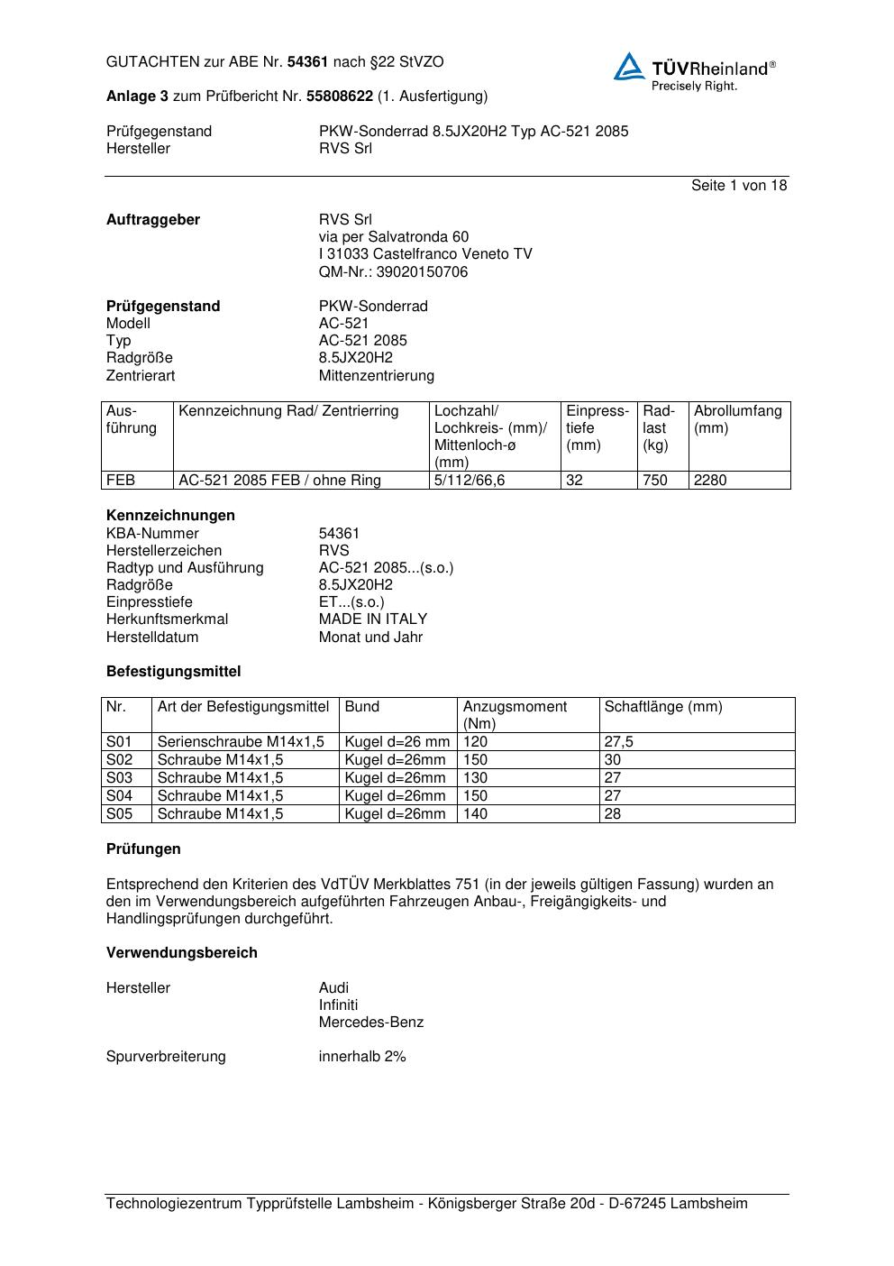 Dieses Gutachten (abe) bezieht sich auf die Alufelge RVS AC-521 2 085 in der Ausführung ET 0, Mittenloch 0 mm (KBA 54361). Im PDF findest du typischerweise zulässige Reifengrößen, Auflagen/Anbauhinweise und – je nach Dokument – Hinweise zur Eintragung.