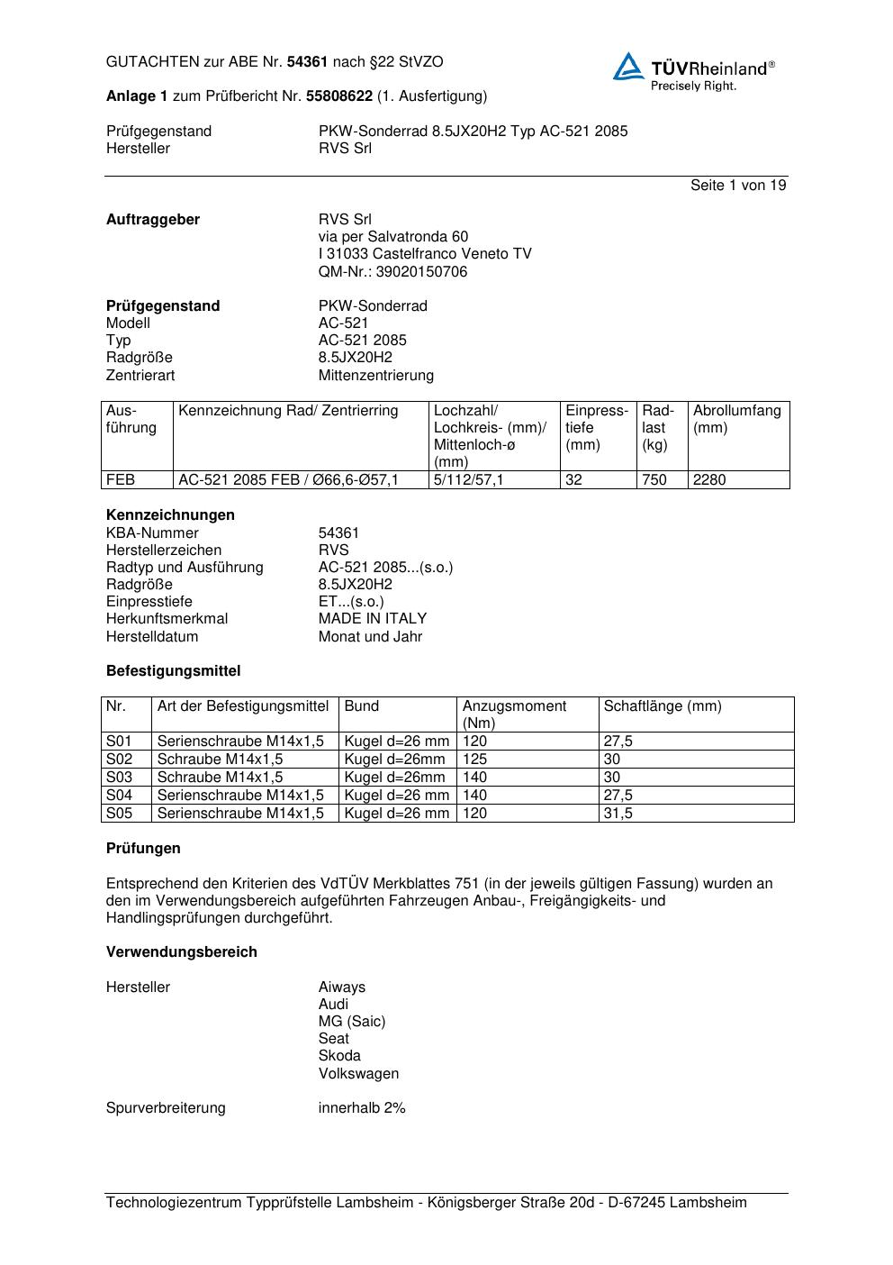 Dieses Gutachten (abe) bezieht sich auf die Alufelge RVS AC-521 2 085 in der Ausführung ET 0, Mittenloch 0 mm (KBA 54361). Im PDF findest du typischerweise zulässige Reifengrößen, Auflagen/Anbauhinweise und – je nach Dokument – Hinweise zur Eintragung.