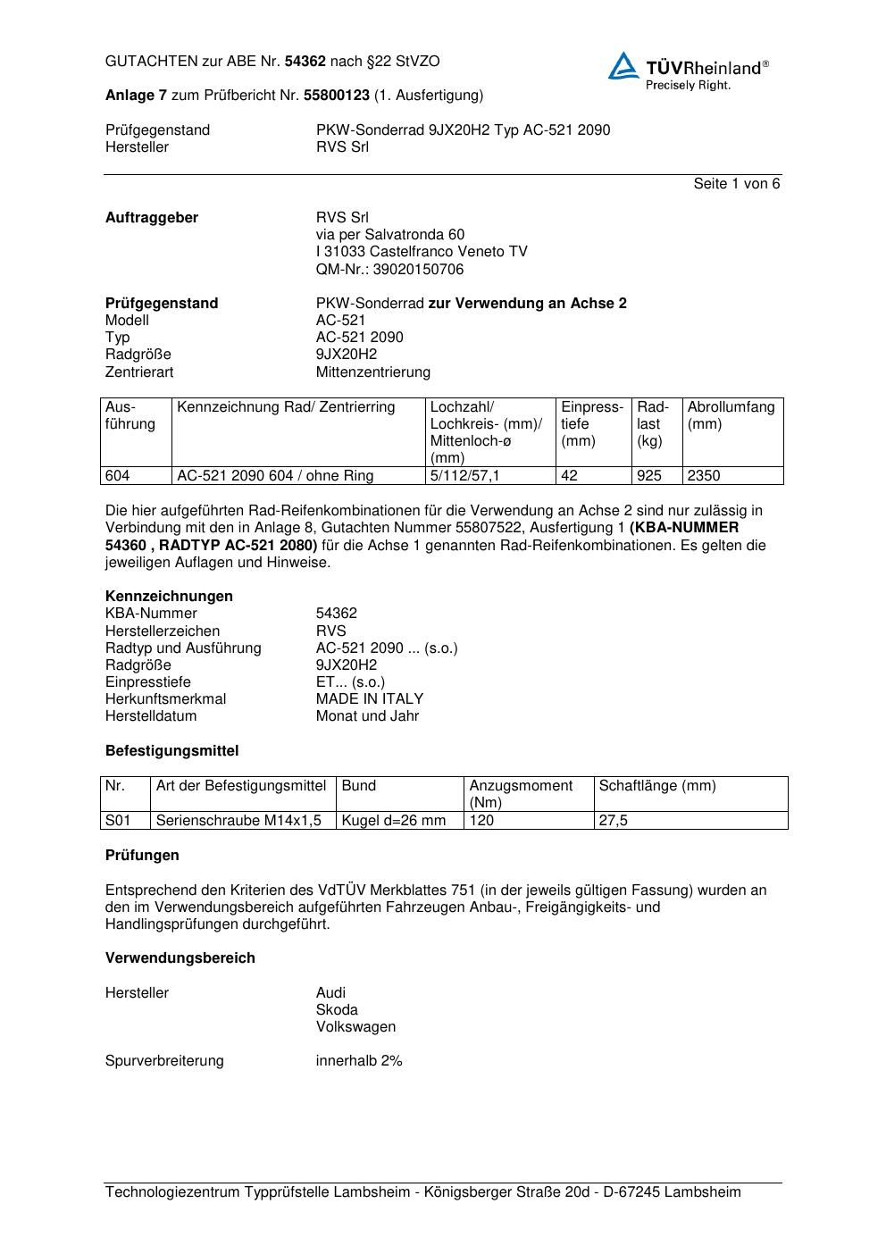Dieses Gutachten (abe) bezieht sich auf die Alufelge RVS AC-521 209 0 in der Ausführung ET 0, Mittenloch 0 mm (KBA 54362). Im PDF findest du typischerweise zulässige Reifengrößen, Auflagen/Anbauhinweise und – je nach Dokument – Hinweise zur Eintragung.