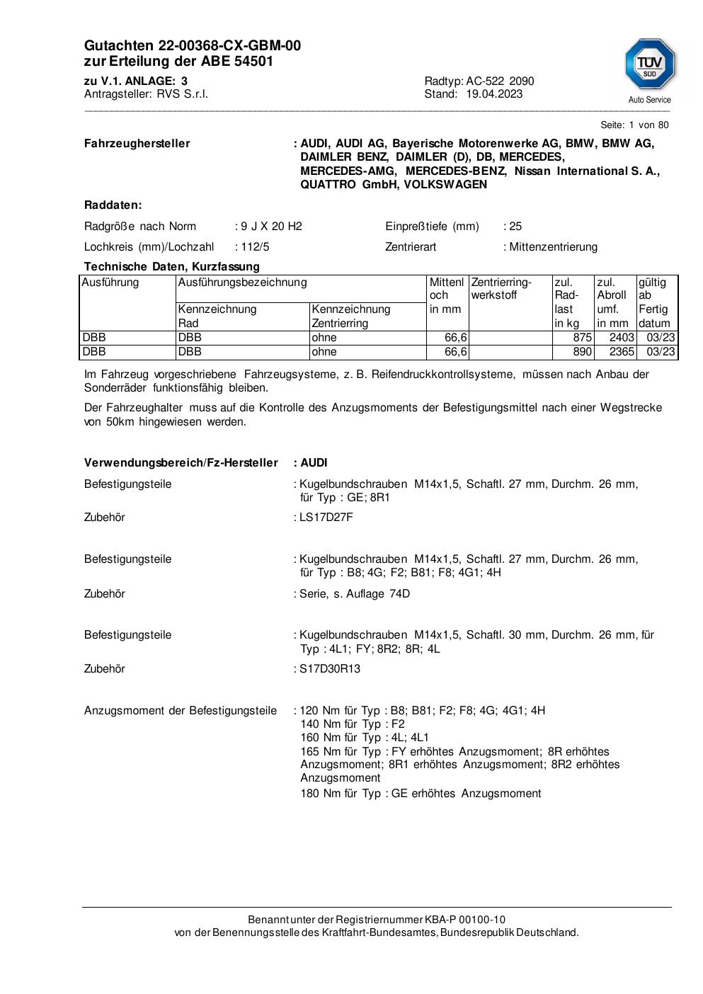 Dieses Gutachten (abe) bezieht sich auf die Alufelge RVS S.r.l. AC-522 2090 in der Ausführung ET 0, Mittenloch 0 mm (KBA 54501). Im PDF findest du typischerweise zulässige Reifengrößen, Auflagen/Anbauhinweise und – je nach Dokument – Hinweise zur Eintragung.