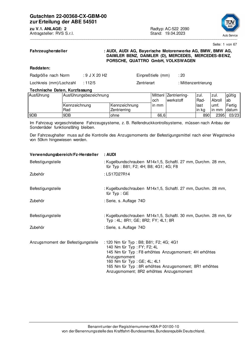 Dieses Gutachten (abe) bezieht sich auf die Alufelge RVS S.r.l. AC-522 2090 in der Ausführung ET 0, Mittenloch 0 mm (KBA 54501). Im PDF findest du typischerweise zulässige Reifengrößen, Auflagen/Anbauhinweise und – je nach Dokument – Hinweise zur Eintragung.