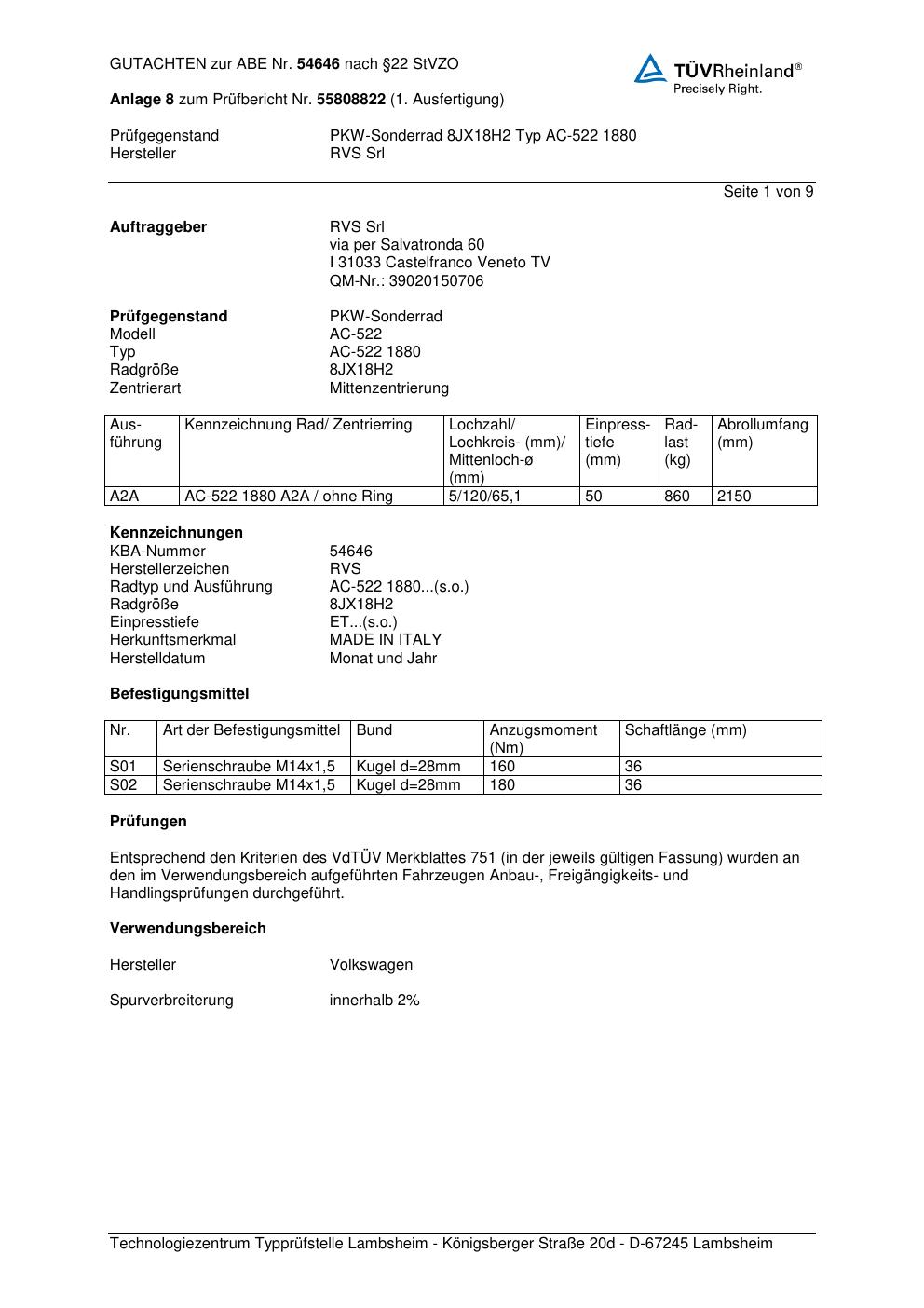 Dieses Gutachten (abe) bezieht sich auf die Alufelge RVS AC-522 188 0 in der Ausführung ET 0, Mittenloch 0 mm (KBA 54646). Im PDF findest du typischerweise zulässige Reifengrößen, Auflagen/Anbauhinweise und – je nach Dokument – Hinweise zur Eintragung.