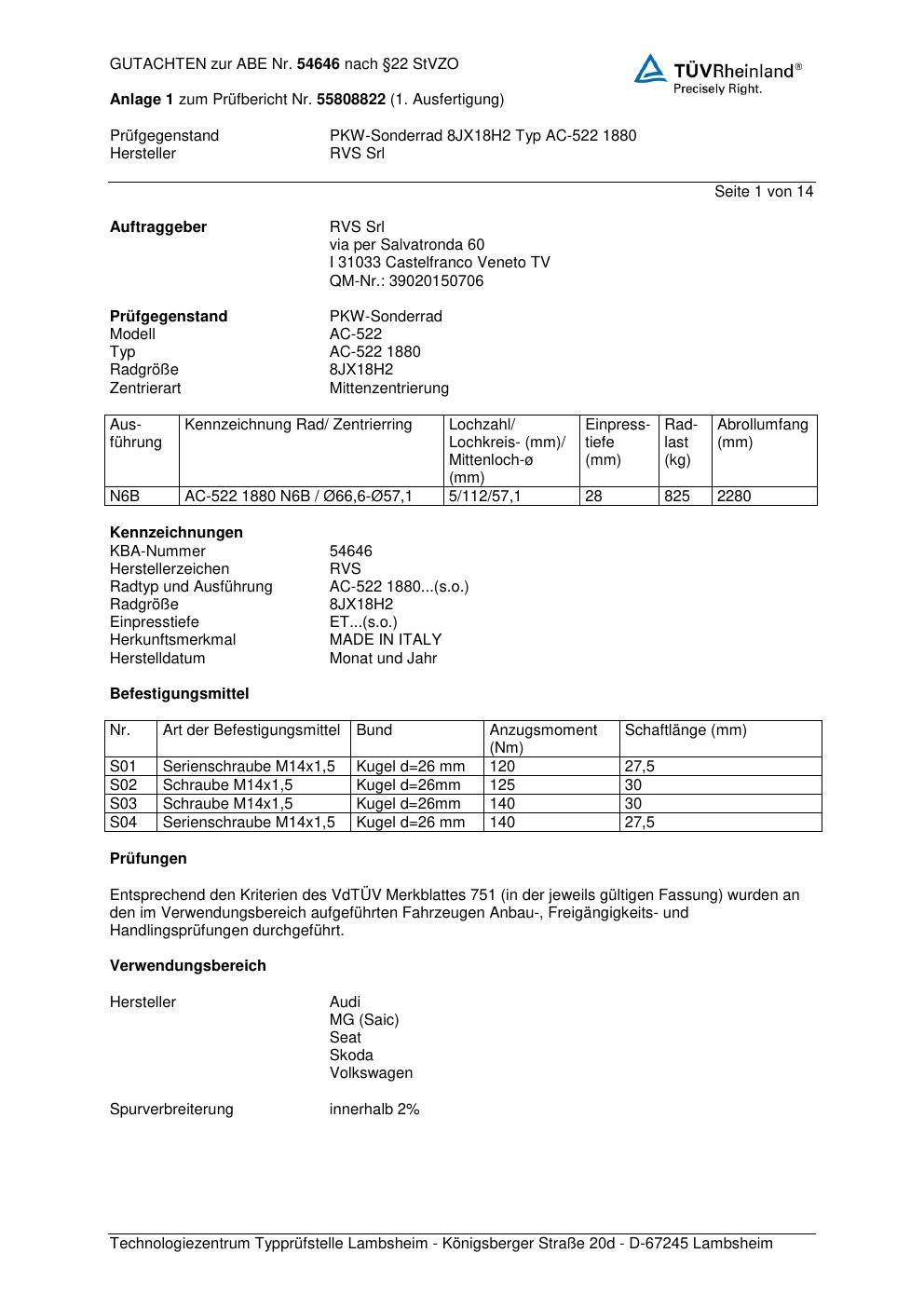 Dieses Gutachten (abe) bezieht sich auf die Alufelge RVS AC-522 188 0 in der Ausführung ET 0, Mittenloch 0 mm (KBA 54646). Im PDF findest du typischerweise zulässige Reifengrößen, Auflagen/Anbauhinweise und – je nach Dokument – Hinweise zur Eintragung.