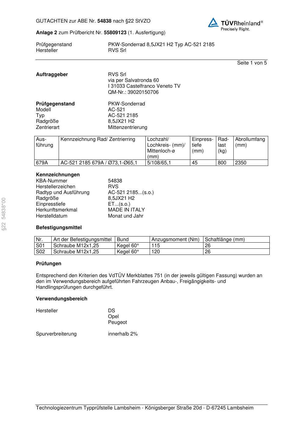 Dieses Gutachten (abe) bezieht sich auf die Alufelge RVS Srl AC-521 2185 in der Ausführung ET 0, Mittenloch 0 mm (KBA 54838). Im PDF findest du typischerweise zulässige Reifengrößen, Auflagen/Anbauhinweise und – je nach Dokument – Hinweise zur Eintragung.