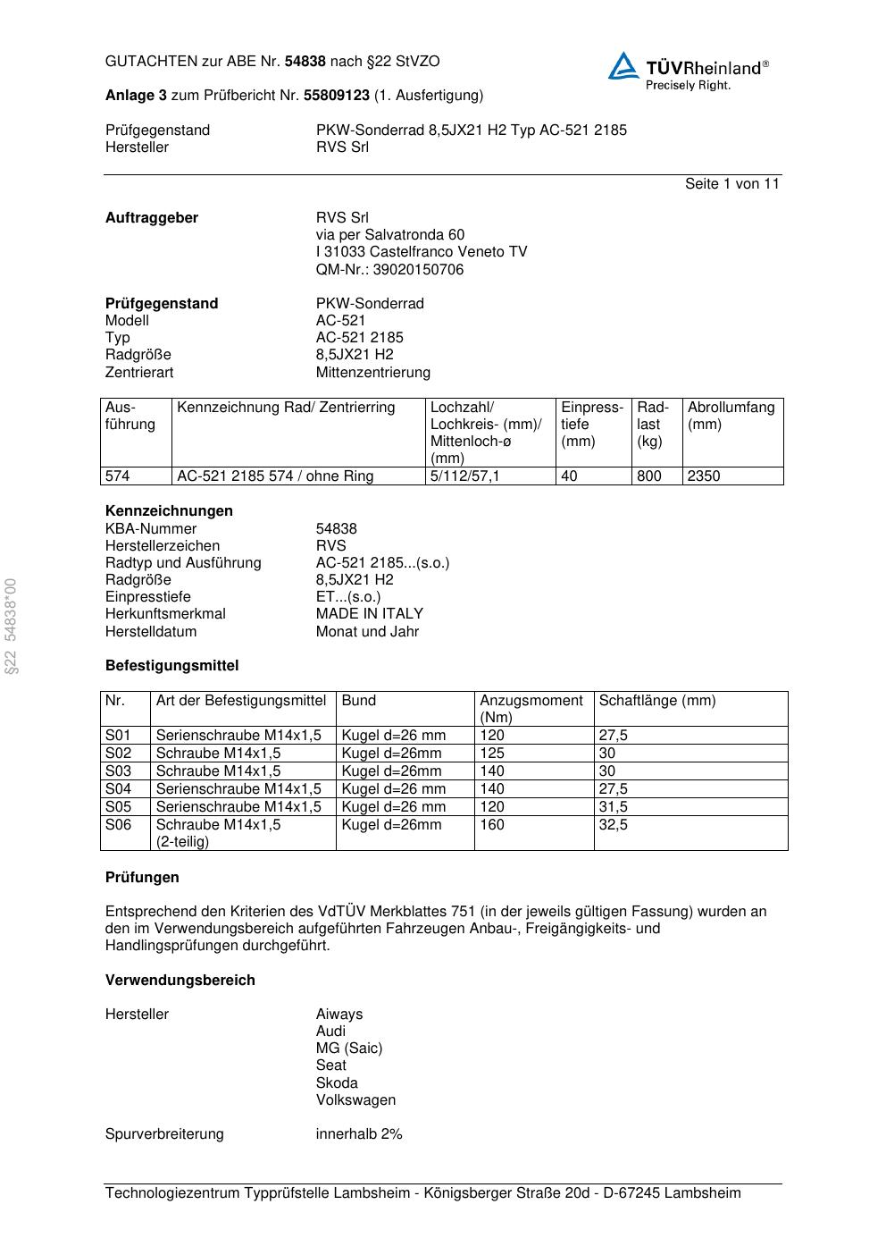 Felgengutachten / abe für Alufelgen RVS Srl AC-521 2185 (ET 0, Mittenloch 0 mm) mit KBA 54838 (Zertifikatsnummer 54838). Hier kostenlos als PDF herunterladen. Der Download-Link ist 24 Stunden gültig und kann bis zu zwei Mal verwendet werden.