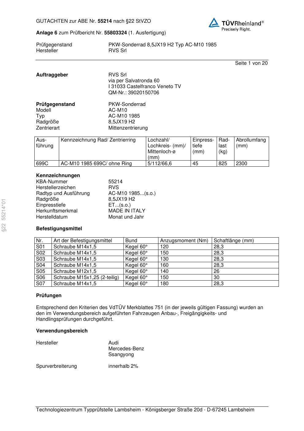 Dieses Gutachten (abe) bezieht sich auf die Alufelge RVS AC-M10 1985 in der Ausführung ET 0, Mittenloch 0 mm (KBA 55214). Im PDF findest du typischerweise zulässige Reifengrößen, Auflagen/Anbauhinweise und – je nach Dokument – Hinweise zur Eintragung.