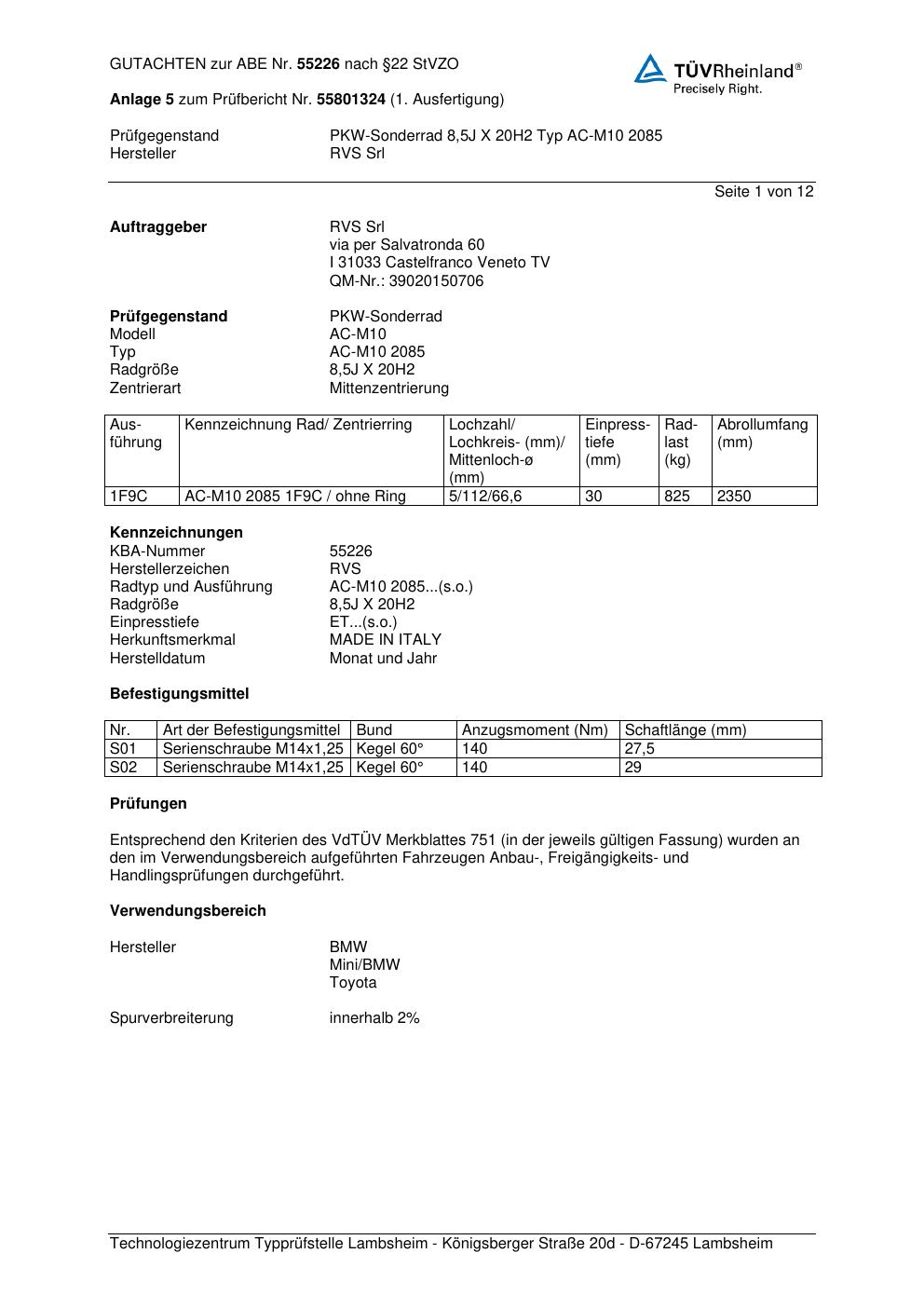 Dieses Gutachten (abe) bezieht sich auf die Alufelge RVS Srl AC-M10 2085 in der Ausführung ET 0, Mittenloch 0 mm (KBA 55226). Im PDF findest du typischerweise zulässige Reifengrößen, Auflagen/Anbauhinweise und – je nach Dokument – Hinweise zur Eintragung.