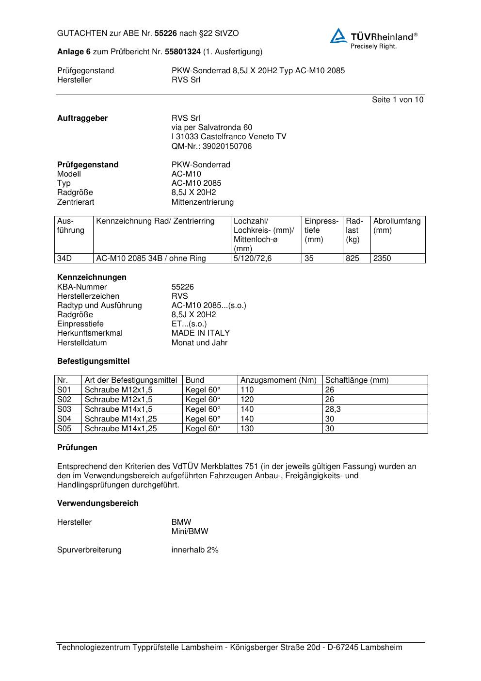 Dieses Gutachten (abe) bezieht sich auf die Alufelge RVS Srl AC-M10 2085 in der Ausführung ET 0, Mittenloch 0 mm (KBA 55226). Im PDF findest du typischerweise zulässige Reifengrößen, Auflagen/Anbauhinweise und – je nach Dokument – Hinweise zur Eintragung.