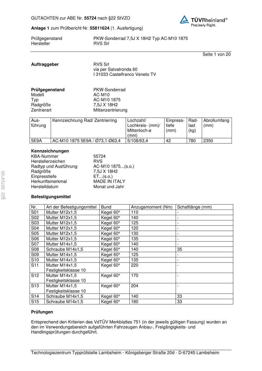 Dieses Gutachten (abe) bezieht sich auf die Alufelge RVS AC-M10 1875 in der Ausführung ET 0, Mittenloch 0 mm (KBA 55724). Im PDF findest du typischerweise zulässige Reifengrößen, Auflagen/Anbauhinweise und – je nach Dokument – Hinweise zur Eintragung.