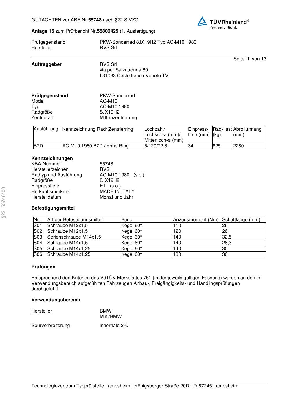 Dieses Gutachten (abe) bezieht sich auf die Alufelge RVS Srl AC-M10 198 0 in der Ausführung ET 0, Mittenloch 0 mm (KBA 55748). Im PDF findest du typischerweise zulässige Reifengrößen, Auflagen/Anbauhinweise und – je nach Dokument – Hinweise zur Eintragung.