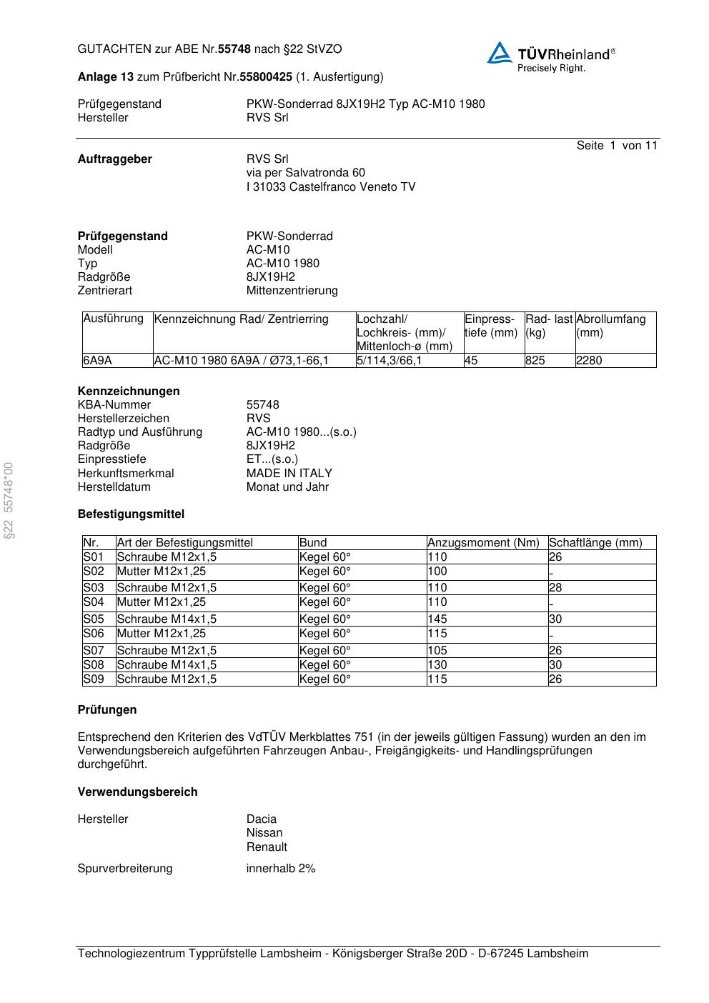 Dieses Gutachten (abe) bezieht sich auf die Alufelge RVS Srl AC-M10 198 0 in der Ausführung ET 0, Mittenloch 0 mm (KBA 55748). Im PDF findest du typischerweise zulässige Reifengrößen, Auflagen/Anbauhinweise und – je nach Dokument – Hinweise zur Eintragung.