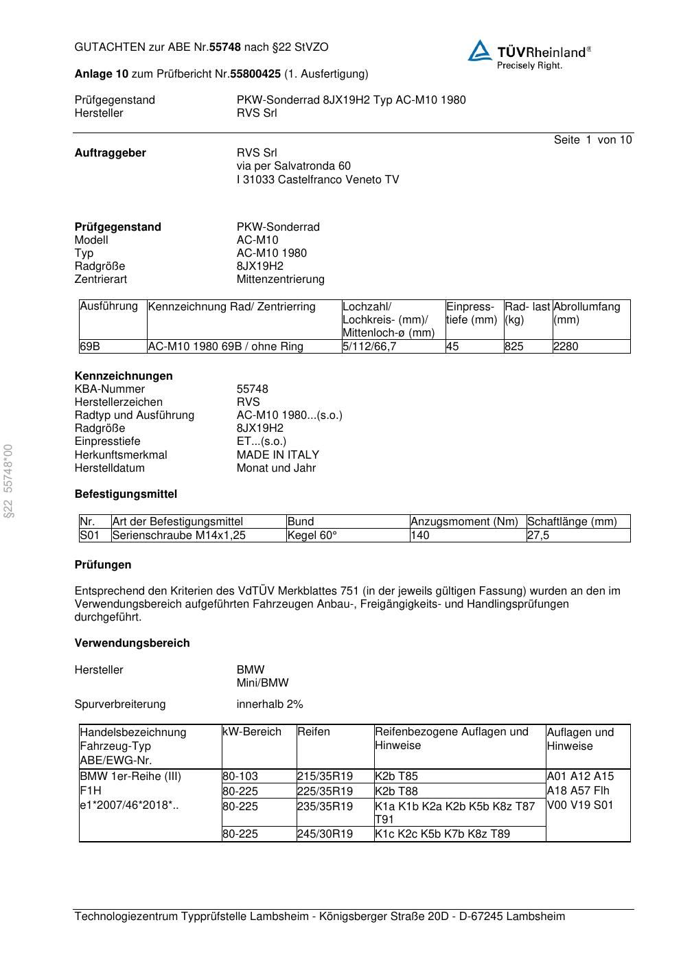 Dieses Gutachten (abe) bezieht sich auf die Alufelge RVS Srl AC-M10 1980 in der Ausführung ET 0, Mittenloch 0 mm (KBA 55748). Im PDF findest du typischerweise zulässige Reifengrößen, Auflagen/Anbauhinweise und – je nach Dokument – Hinweise zur Eintragung.