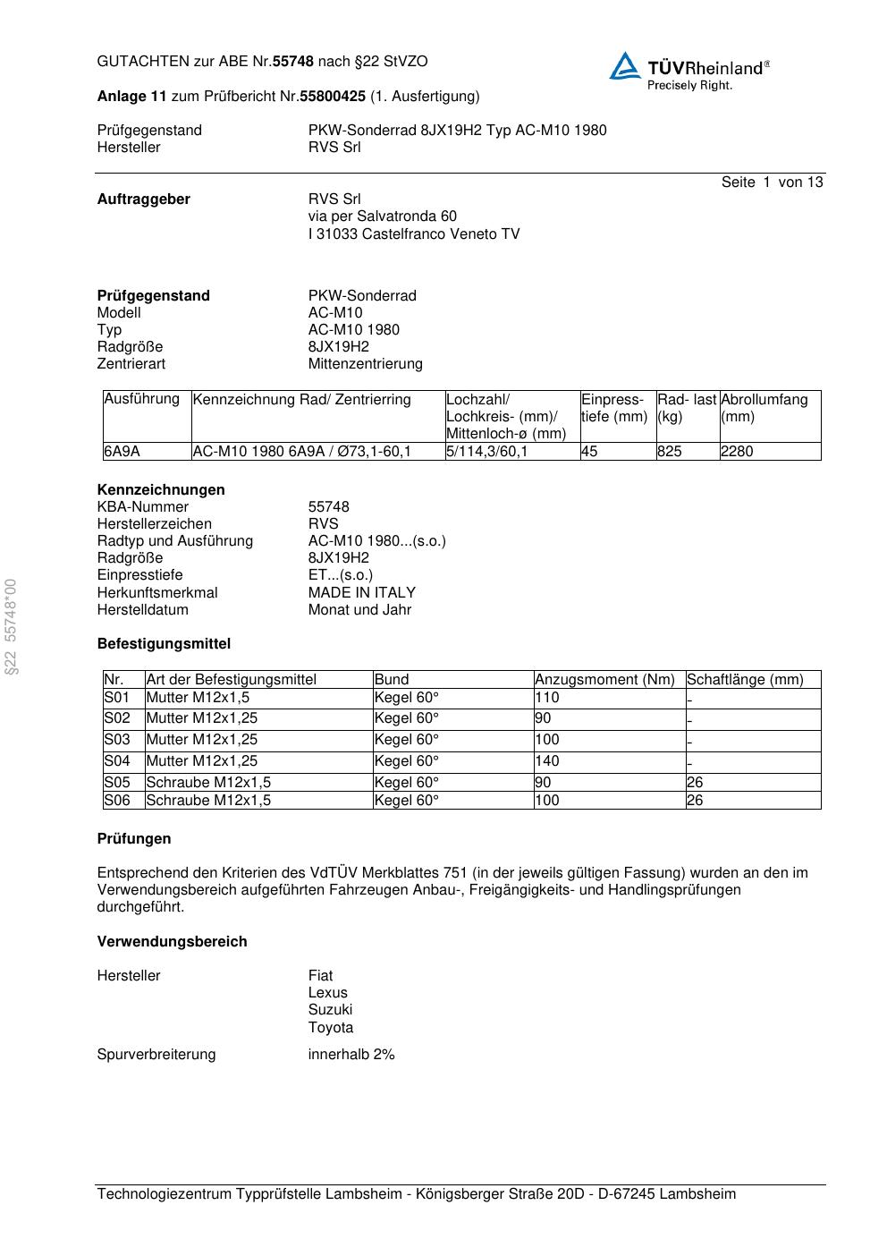 Dieses Gutachten (abe) bezieht sich auf die Alufelge RVS Srl AC-M10 198 0 in der Ausführung ET 0, Mittenloch 0 mm (KBA 55748). Im PDF findest du typischerweise zulässige Reifengrößen, Auflagen/Anbauhinweise und – je nach Dokument – Hinweise zur Eintragung.