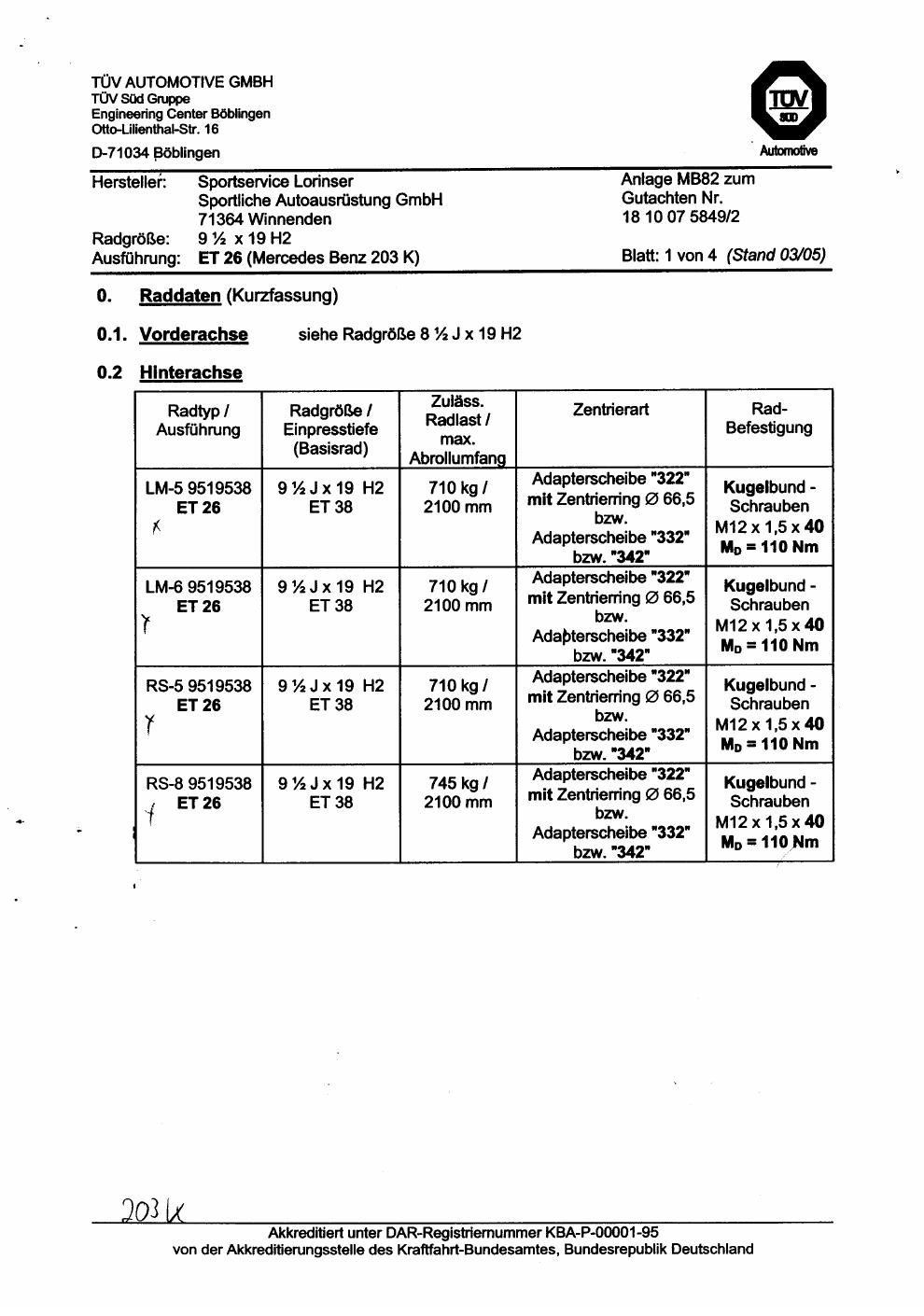 Dieses Gutachten (ece) bezieht sich auf die Alufelge Sportservice Lorinser LM-5 in der Ausführung ET 0, Mittenloch 0 mm . Im PDF findest du typischerweise zulässige Reifengrößen, Auflagen/Anbauhinweise und – je nach Dokument – Hinweise zur Eintragung.