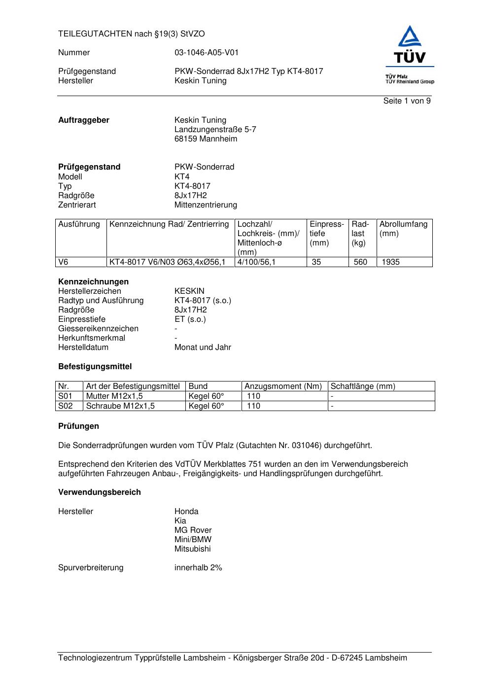 Felgengutachten / teilegutachten für Alufelgen co-rod KT4-8017 (8Jx17 ET 0, Mittenloch 0 mm) (Zertifikatsnummer 031046). Hier kostenlos als PDF herunterladen. Der Download-Link ist 24 Stunden gültig und kann bis zu zwei Mal verwendet werden.
