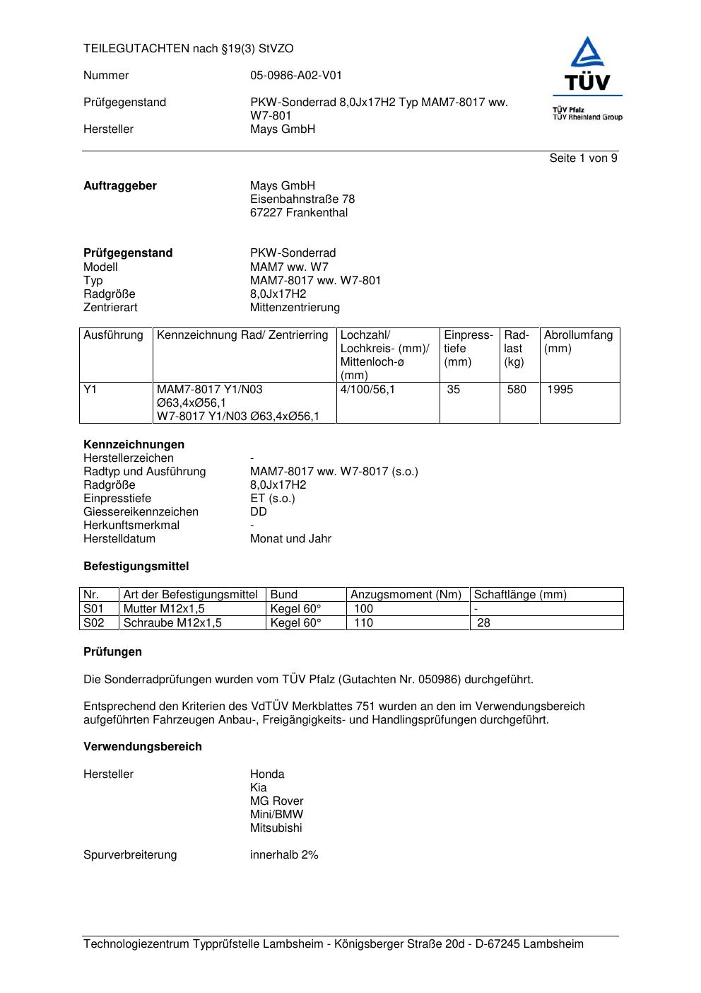 Felgengutachten / teilegutachten für Alufelgen co-rod MAM7-8017 (8Jx17 ET 0, Mittenloch 0 mm) (Zertifikatsnummer 050986). Hier kostenlos als PDF herunterladen. Der Download-Link ist 24 Stunden gültig und kann bis zu zwei Mal verwendet werden.