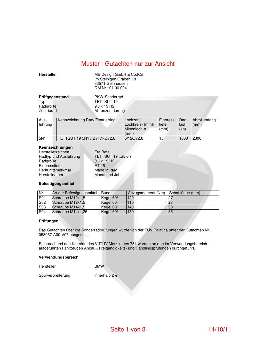 Felgengutachten / teilegutachten für Alufelgen co-rod TETTSUT 19 (9Jx19 ET 0, Mittenloch 0 mm) (Zertifikatsnummer 058057-a00-v07). Hier kostenlos als PDF herunterladen. Der Download-Link ist 24 Stunden gültig und kann bis zu zwei Mal verwendet werden.