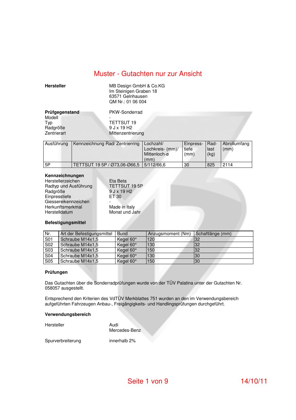 Felgengutachten / teilegutachten für Alufelgen co-rod TETTSUT 19 (9Jx19 ET 0, Mittenloch 0 mm) (Zertifikatsnummer 058057). Hier kostenlos als PDF herunterladen. Der Download-Link ist 24 Stunden gültig und kann bis zu zwei Mal verwendet werden.