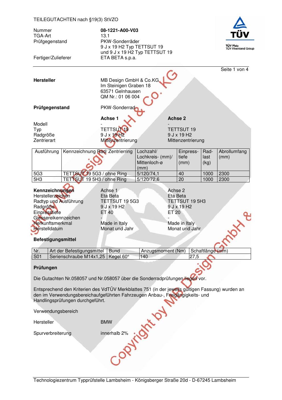 Felgengutachten / teilegutachten für Alufelgen co-rod TETTSUT 19 (9Jx19 ET 0, Mittenloch 0 mm) (Zertifikatsnummer 058057). Hier kostenlos als PDF herunterladen. Der Download-Link ist 24 Stunden gültig und kann bis zu zwei Mal verwendet werden.