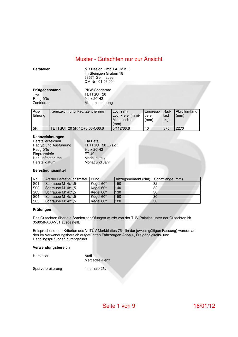 Felgengutachten / teilegutachten für Alufelgen co-rod TETTSUT 20 (9Jx2 ET 0, Mittenloch 0 mm) (Zertifikatsnummer 058058-a00-v01). Hier kostenlos als PDF herunterladen. Der Download-Link ist 24 Stunden gültig und kann bis zu zwei Mal verwendet werden.