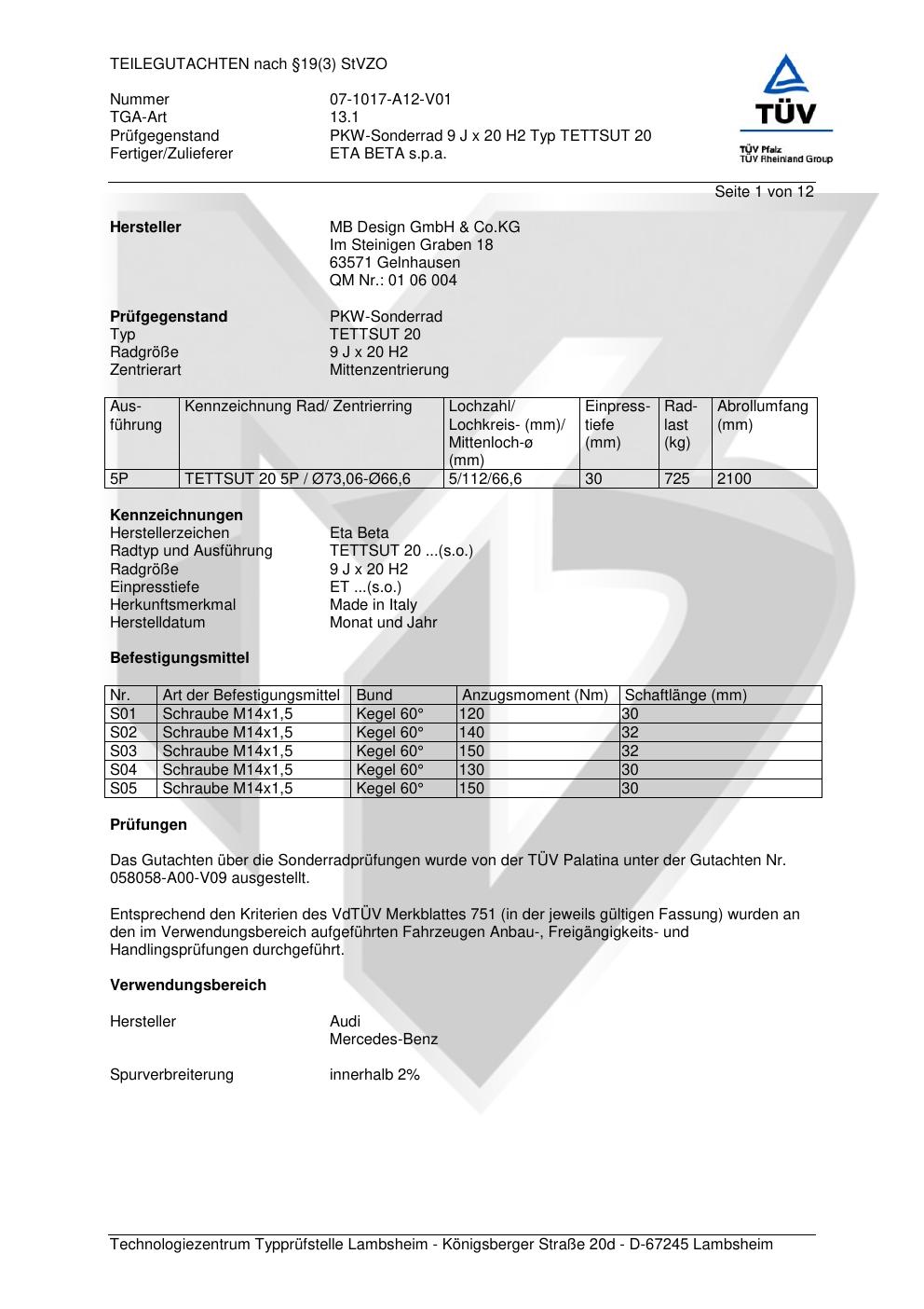 Felgengutachten / teilegutachten für Alufelgen co-rod TETTSUT 20 (9Jx2 ET 0, Mittenloch 0 mm) (Zertifikatsnummer 058058-a00-v09). Hier kostenlos als PDF herunterladen. Der Download-Link ist 24 Stunden gültig und kann bis zu zwei Mal verwendet werden.