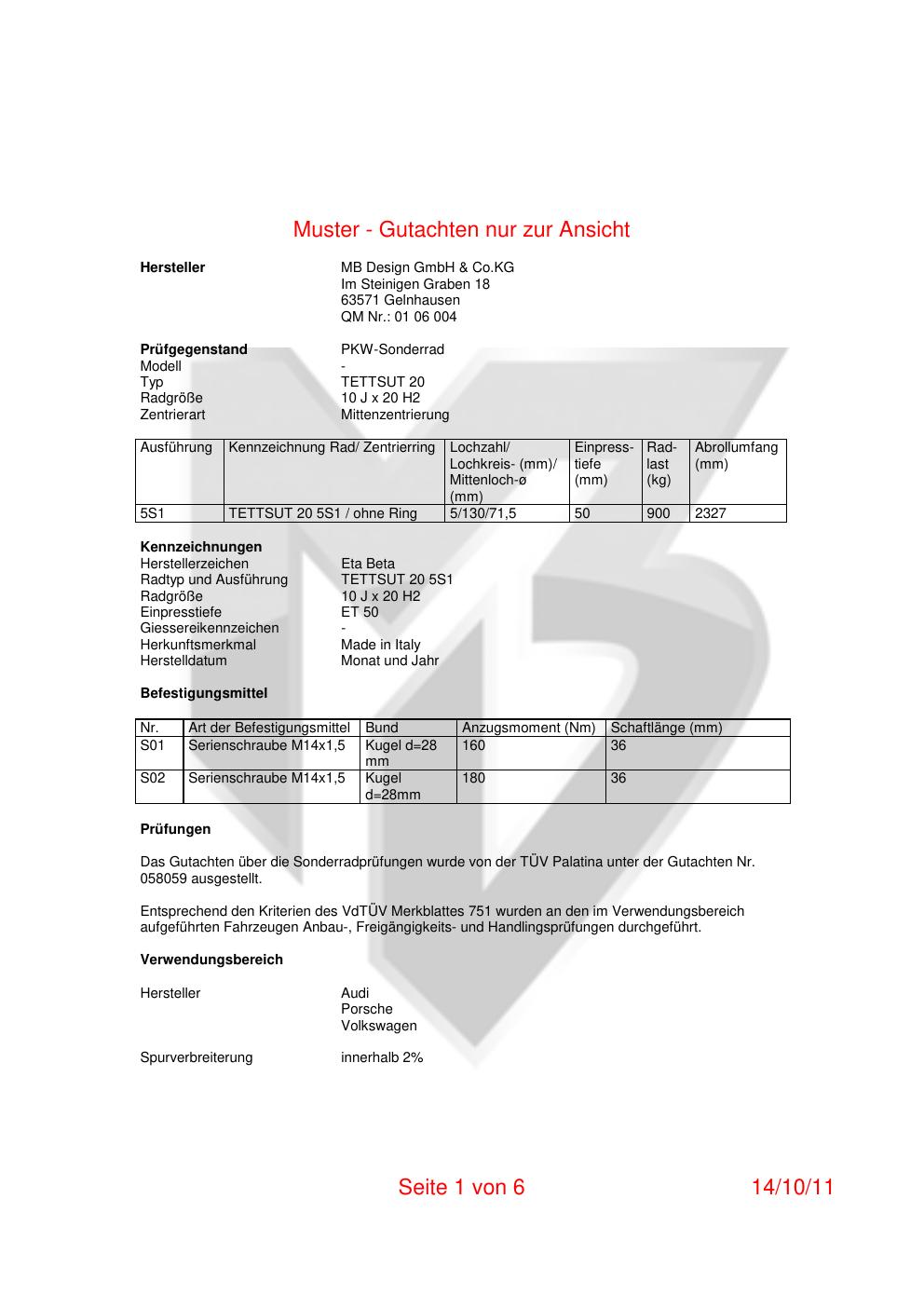 Felgengutachten / teilegutachten für Alufelgen co-rod TETTSUT 20 (10Jx2 ET 0, Mittenloch 0 mm) (Zertifikatsnummer 058059). Hier kostenlos als PDF herunterladen. Der Download-Link ist 24 Stunden gültig und kann bis zu zwei Mal verwendet werden.