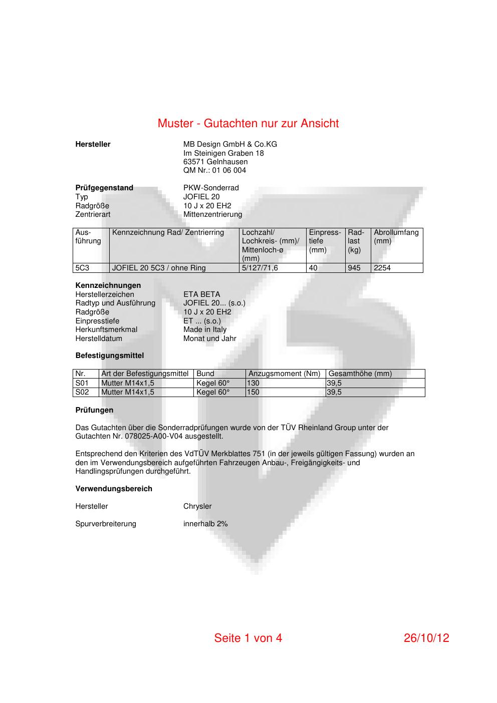 Dieses Gutachten (teilegutachten) bezieht sich auf die Alufelge co-rod JOFIEL 20 in der Ausführung 10Jx2 ET 0, Mittenloch 0 mm . Im PDF findest du typischerweise zulässige Reifengrößen, Auflagen/Anbauhinweise und – je nach Dokument – Hinweise zur Eintragung.