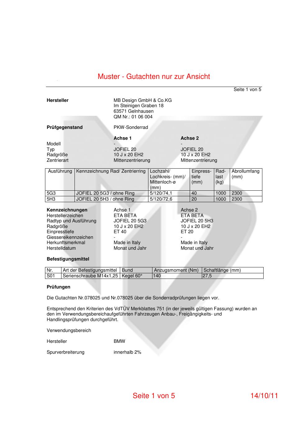 Felgengutachten / teilegutachten für Alufelgen co-rod JOFIEL 20 (10Jx2 ET 0, Mittenloch 0 mm) (Zertifikatsnummer 078025). Hier kostenlos als PDF herunterladen. Der Download-Link ist 24 Stunden gültig und kann bis zu zwei Mal verwendet werden.