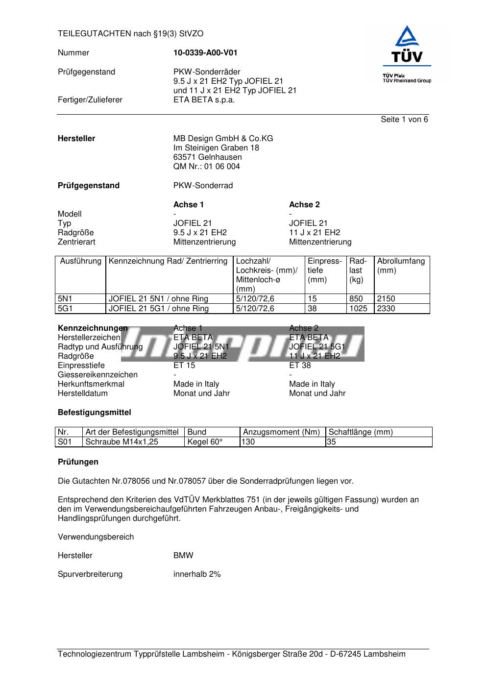 Dieses Gutachten (teilegutachten) bezieht sich auf die Alufelge co-rod JOFIEL 21 in der Ausführung 9.5Jx21 ET 0, Mittenloch 0 mm . Im PDF findest du typischerweise zulässige Reifengrößen, Auflagen/Anbauhinweise und – je nach Dokument – Hinweise zur Eintragung.