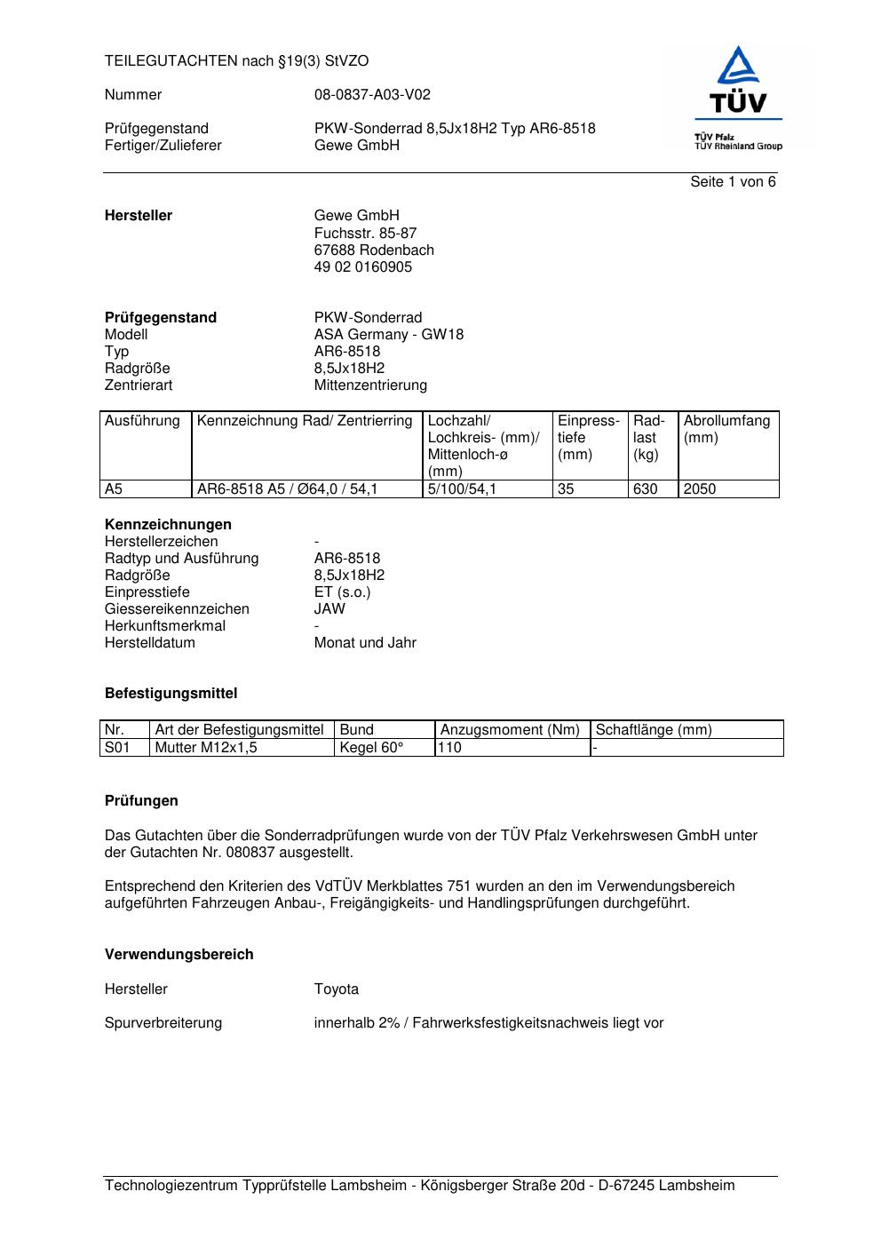 Dieses Gutachten (teilegutachten) bezieht sich auf die Alufelge co-rod AR6-8518 in der Ausführung 8.5Jx18 ET 0, Mittenloch 0 mm . Im PDF findest du typischerweise zulässige Reifengrößen, Auflagen/Anbauhinweise und – je nach Dokument – Hinweise zur Eintragung.