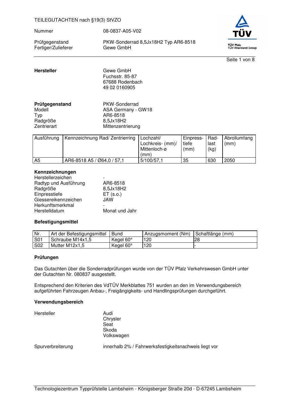 Dieses Gutachten (teilegutachten) bezieht sich auf die Alufelge co-rod AR6-8518 in der Ausführung 8.5Jx18 ET 0, Mittenloch 0 mm . Im PDF findest du typischerweise zulässige Reifengrößen, Auflagen/Anbauhinweise und – je nach Dokument – Hinweise zur Eintragung.