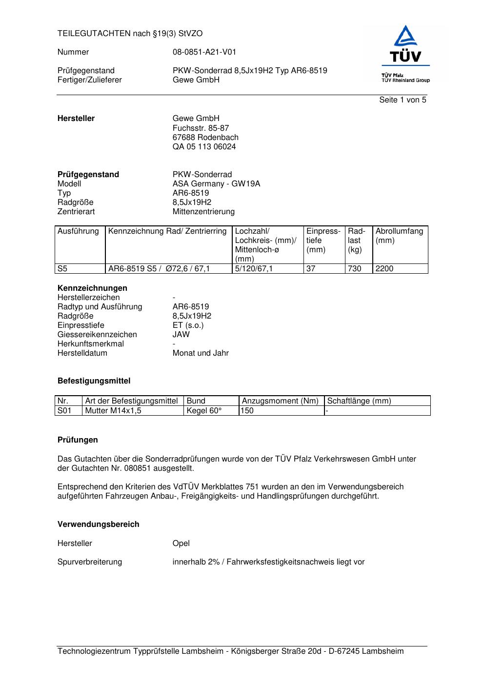 Dieses Gutachten (teilegutachten) bezieht sich auf die Alufelge co-rod AR6-8519 in der Ausführung 8.5Jx19 ET 0, Mittenloch 0 mm . Im PDF findest du typischerweise zulässige Reifengrößen, Auflagen/Anbauhinweise und – je nach Dokument – Hinweise zur Eintragung.