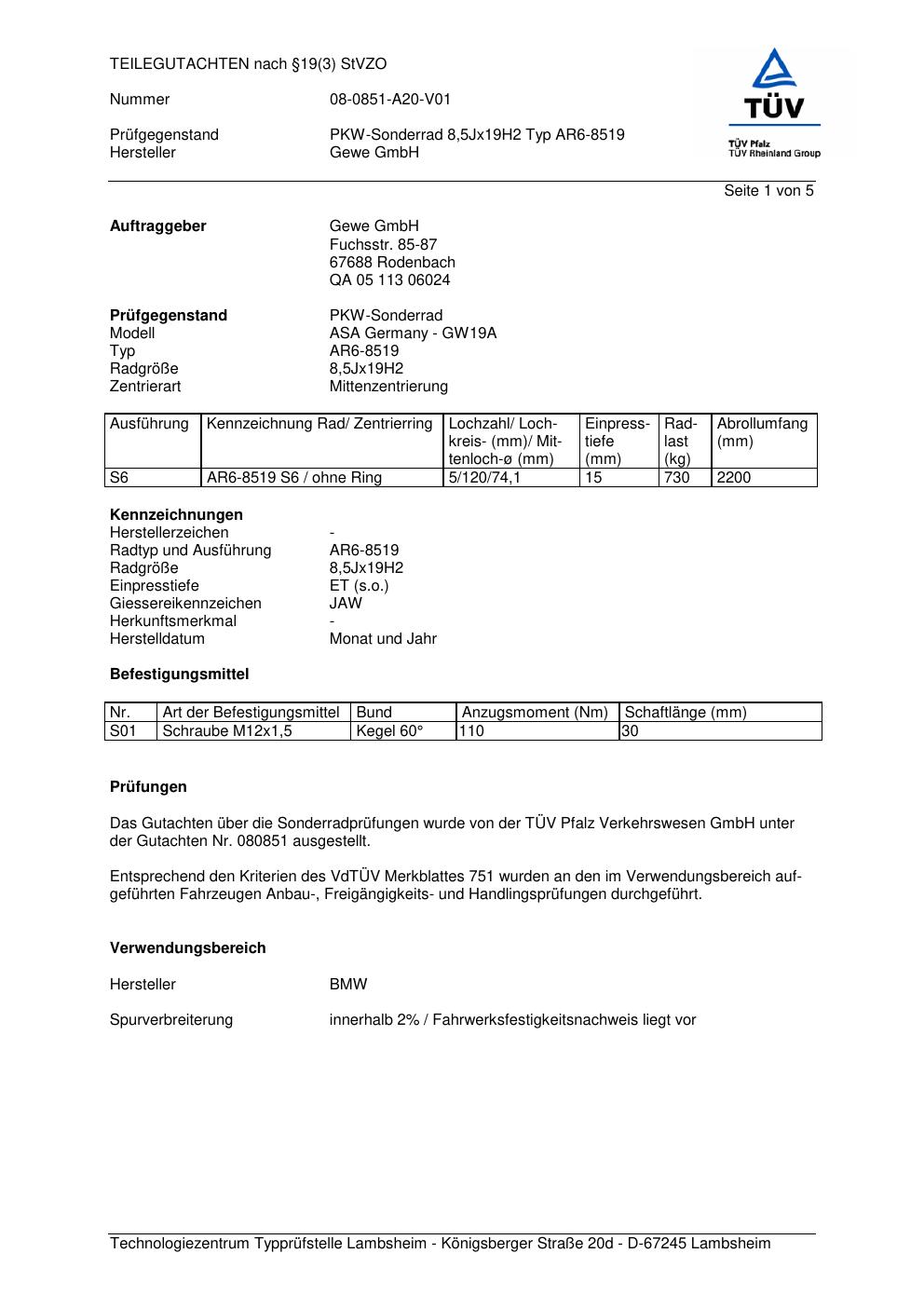 Felgengutachten / teilegutachten für Alufelgen co-rod AR6-8519 (8.5Jx19 ET 0, Mittenloch 0 mm) (Zertifikatsnummer 080851). Hier kostenlos als PDF herunterladen. Der Download-Link ist 24 Stunden gültig und kann bis zu zwei Mal verwendet werden.