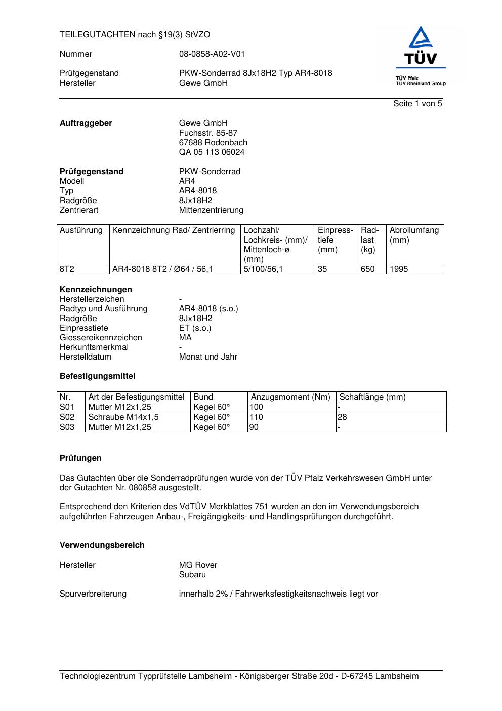teilegutachten 080858 co-rod AR4-8018